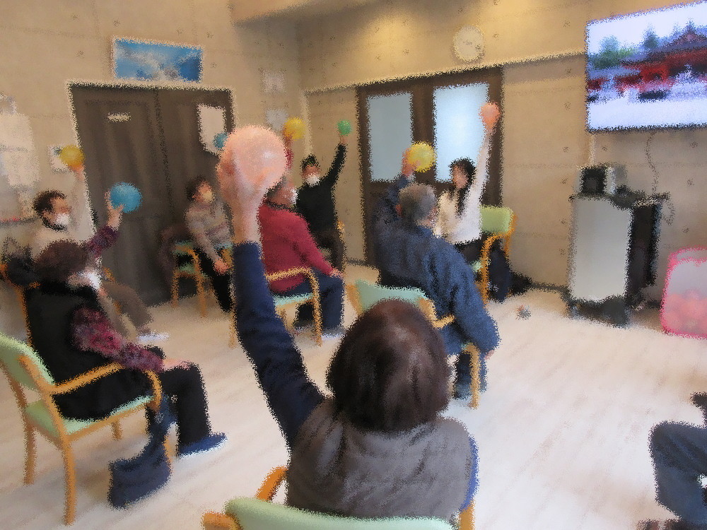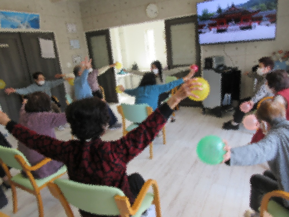 後半にはボールを使ってアップテンポな音楽に合わせて体操していきました。