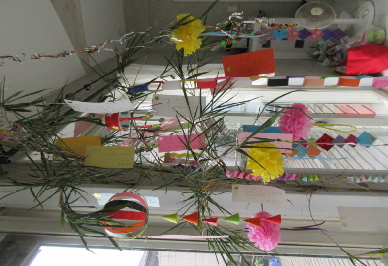 七夕の短冊に願い事を書いてもらい、笹に短冊と七夕の飾りを飾って頂きました☆ 飾り付けも協力し合い、とても楽しそうでした(*^_^*)