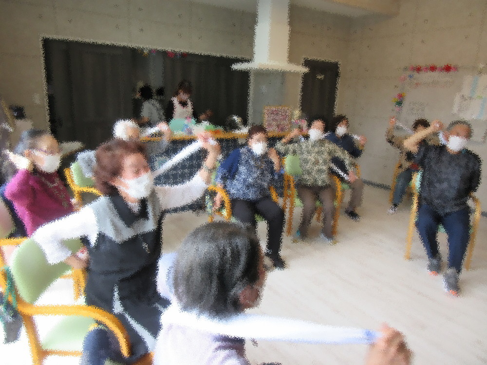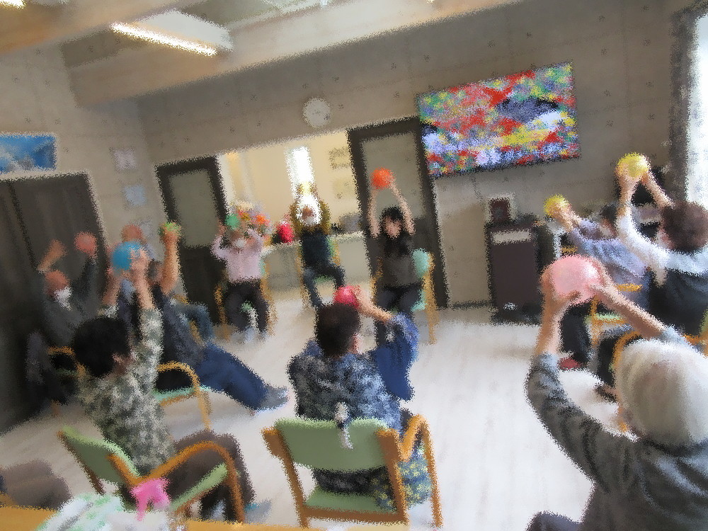 本日の体操の前にゴールデンウィークをどのように過ごされたかを一人ずつ聞いていきました。 ご家族やお孫さんと過ごされたり、お家でゆっくりされており、それぞれ充実したお休みを過ごされていました。 普段とは違う日常を過ごされてかどこかお疲れ気味な様子で、本日の体操は呼吸を意識しながらゆっくりとストレッチをしていきました。 一つ一つをしっかりと伸ばしストレッチしていくことで簡単なストレッチでも軽くなったり動きやすくなるのを実感できます。 後半はボールやタオルを使った全身運動をしていきました。 ボールを足の間に挟んで押しつぶす体操も時間さえあれば出来る簡単なものですが、 普段の運動では鍛えにくい内転筋を鍛えることができて失禁を防ぐ為に特におすすめの体操です。 タオルを使った運動は「いい湯だな」の音楽に乗せて全身を洗う体操をしていきました。 何歳になっても自分のことは自分で出来るように、そして湯船につかることの大切さを話しながらノリノリで行いました! 体操が終わる頃にはみなさんじんわり汗をかいており呼吸を落ち着かせながら足先の体操を紹介しました。 足先もとても重要で転ばないためにも、もし躓いてしまった時に踏みとどまれるように、しっかり足先も鍛えていきたいですね! 最後は瞑想をして終わりました。 全身の力を抜いて何も考えずただ無になって行う瞑想も気持ちを落ち着かせるのにおすすめです。 自分の中の悪いもの・いらないものを吐き出し、外からの力や新しい空気を十分に吸い込んで本日の体操は終わりました。