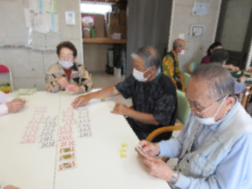 午後からはトランプ・麻雀・ペーパークラフトに分かれて活動していきました。 ペーパークラフトではお休みの方がいたのでお一人でしたがお話しをしながらも集中して切り絵を行っていました。 どのチームもおしゃべりが盛んで、笑い声や罰ゲームの歓声が聞こえる楽しい時間を過ごされていました。