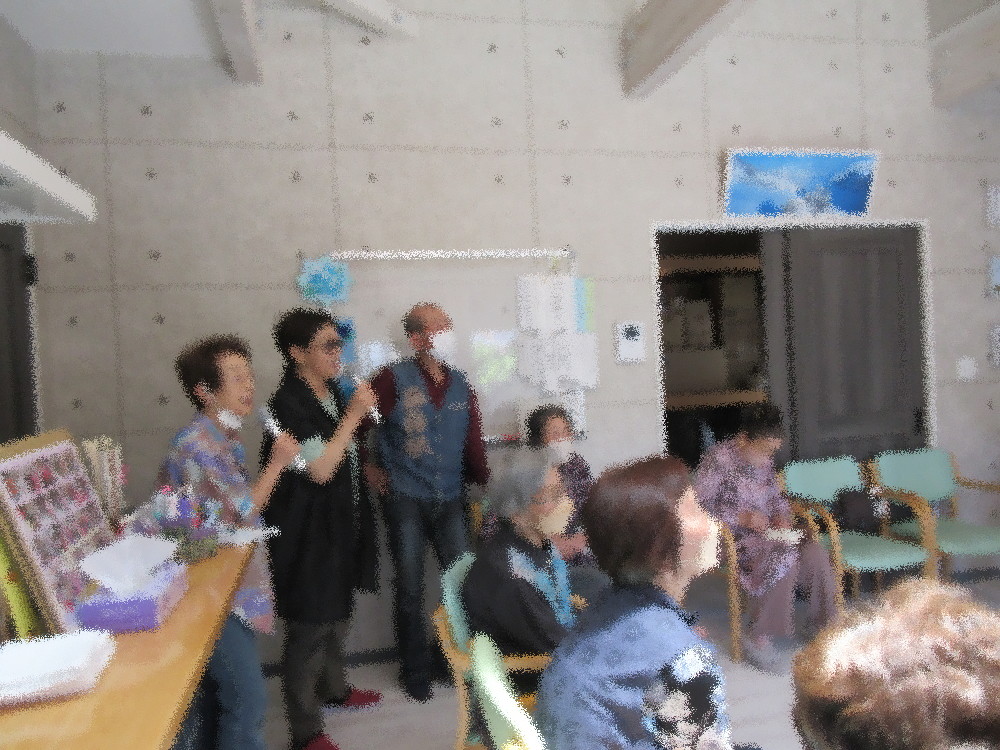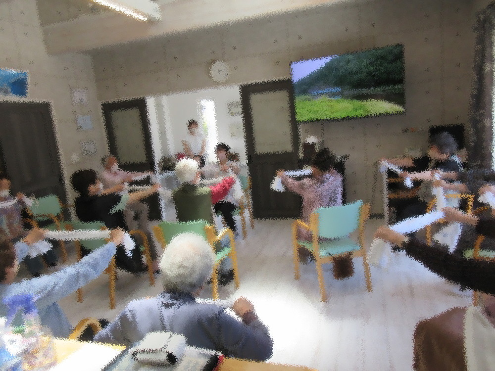 本日のサロンでは全身を摩ったり伸ばしたりと簡単なストレッチからのんびりと始まりました。 耳のストレッチや肩周りの運動・下半身のストレッチや筋トレを行いタオルを使って更に伸ばしていきました。 タオルの両端を持って腕の上げ下げや上半身をひねっていき、 最後は指先の運動もかねてタオルを伸ばした状態から誰が一番早く指先だけで集められるかを競っていきました! みなさんとっても早く、競技となるとみなさん燃えるようで「終わった!」と大きな声で知らせて下さっていました! 体操の後はみなさんで円になって穴埋めクイズをしました。 「お題は “あ○○い” 梅雨の時期に咲く花です」というようなクイズを行ったのですが クイズのコツを掴むまではスタッフからのヒントを待っていたのですが最後の方はすぐに答えられていました!