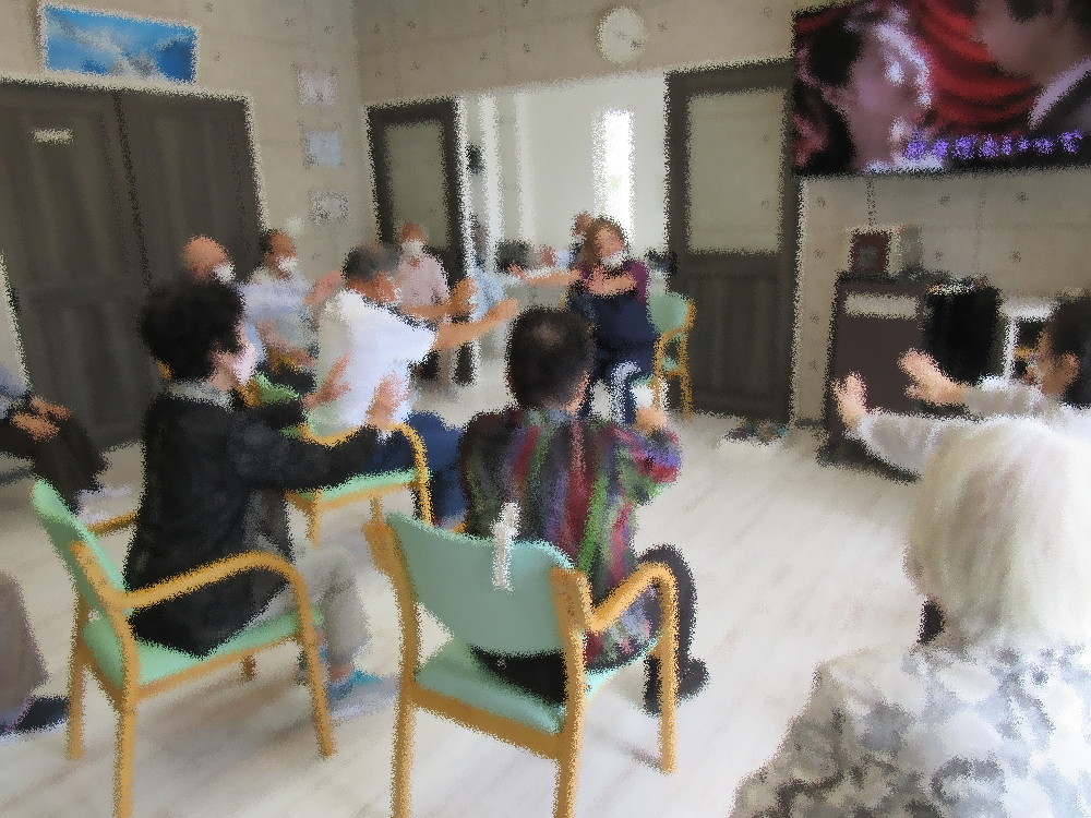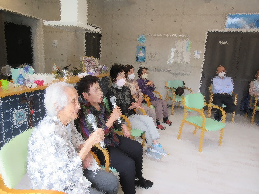 カラオケでは「ふるさと」から始まり、今回はデュエットで歌う方々が多くいらっしゃいました! 仲の良い方同士で顔を見せ合わせたりにっこり笑いながら楽しそうに歌われており、 他の方も手拍子をしたり一緒に口ずさんだりして和気藹々とした雰囲気の中で時間いっぱい行っていました。