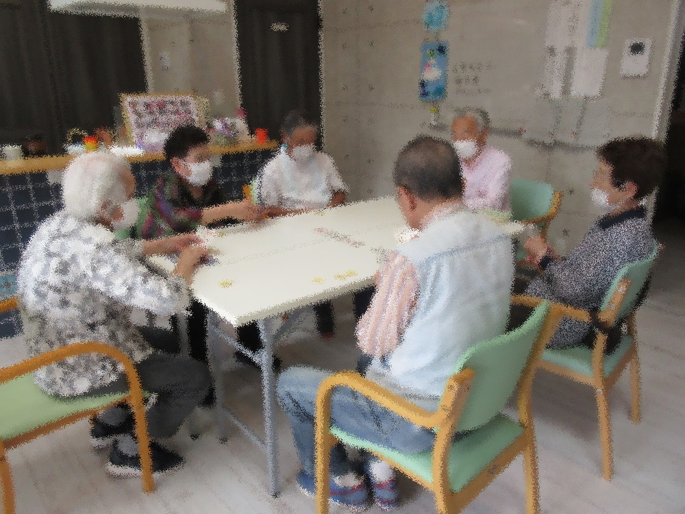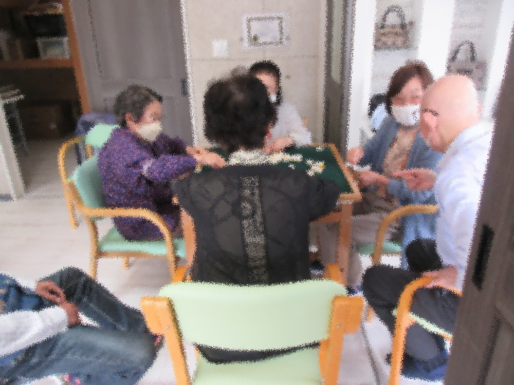 午後からはトランプ・麻雀・ぬり絵に分かれて活動しました。 麻雀組は周りで見てくれている男性陣からアドバイスをもらったり一緒に考えながら楽しまれていました。 トランプ組はみなさん手慣れたもので順番に配る係をしながらトランプや罰ゲームで盛り上がっていました。 ぬり絵組は好きな絵を選んでおしゃべりをしながらゆったりとした時間を過ごされていました。