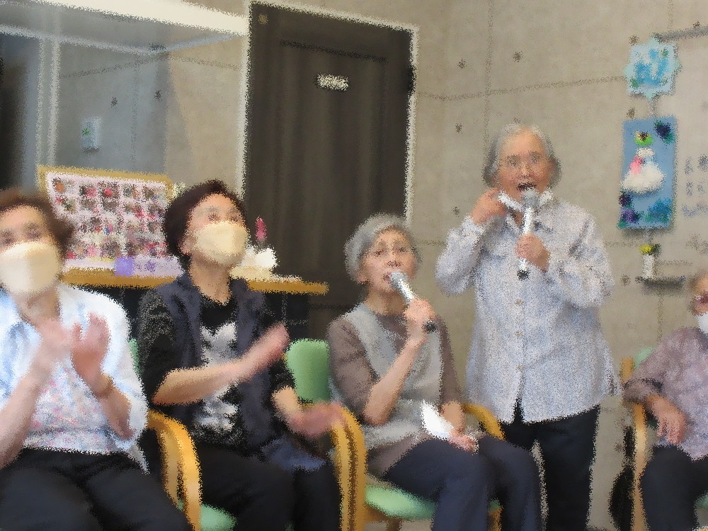 体操が終わり水分補給をした後はおなじみのカラオケタイム! いつも火曜日のサロンに参加されている方が木曜日のカラオケの時間に手伝いに来てくれます。 今週はその方の誕生日ということでサプライズでみなさんからハッピーバースデーの歌のプレゼントをしました。 突然のお祝いに戸惑いつつも照れくさそうにしており、みなさんに「ありがとう」とお礼を言われ今後の抱負を話してくれました。 カラオケでは十八番の曲や新しいお気に入りの歌を披露されとても盛り上がっていました!