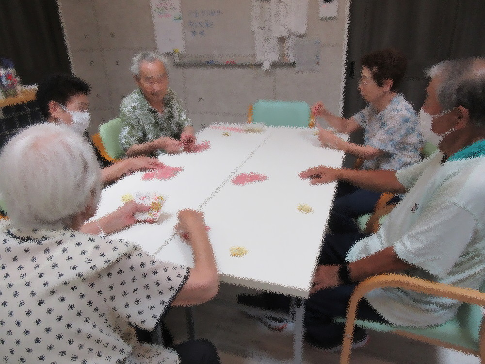 午後からのレクではトランプ・麻雀・切り絵・ぬり絵に分かれて活動し、 切り絵とぬり絵は同じ席でおしゃべりをしながら楽しまれていました。
