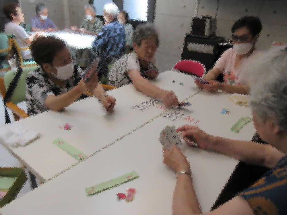 昼食にと桃とおしんこを持ってきて下さったかたがいらっしゃり、みなさんでいただきました。 おいしいご飯に箸も進み、おしゃべりをしながら楽しく召し上がっていました。 午後からは3組に分かれてトランプをして過ごされ、七並べ・ババ抜きを中心に罰ゲームまで盛り上がっていました!