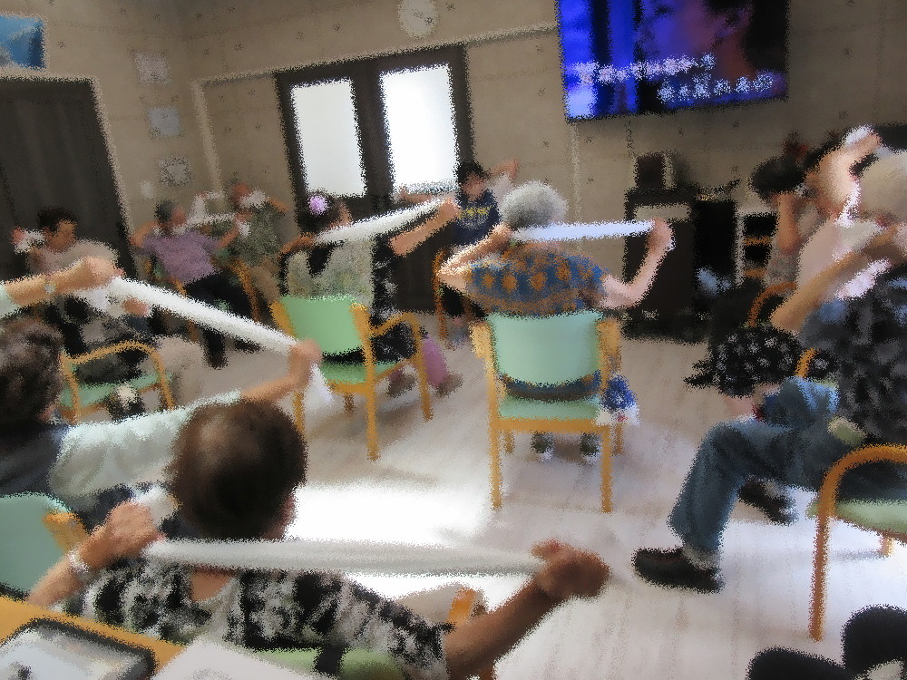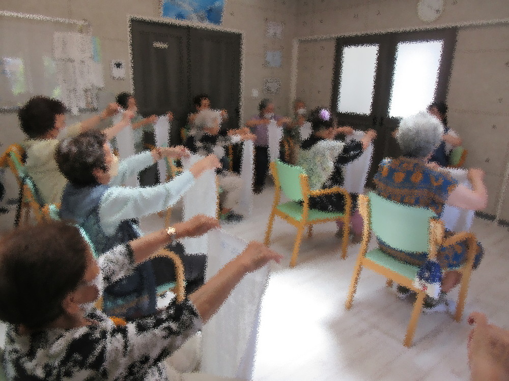 今回のサロンではいつも行っているストレッチや簡単な体操に加え、タオルを使っての運動や指先の体操も行っていきました! 肩周りに集中した運動から上半身をしっかり伸ばして動かしていき、指先の体操ではタオルをたぐり寄せていくレースをしました。 右手・左手・両手と3回行い出来た方から手を上げてもらったのですがみなさんとても早く、 遅れてしまった方も最後まで諦めることなく取り組まれていました。 後半はみなさんで丸くなってジェスチャーゲームをしました。 手振り身振りでみなさんにお題のものを伝え、みなさんに答えてもらいました。 難しいお題の方はスタッフがヒントを出したり一緒にジェスチャーをしながら1周回りきる事が出来ていました。