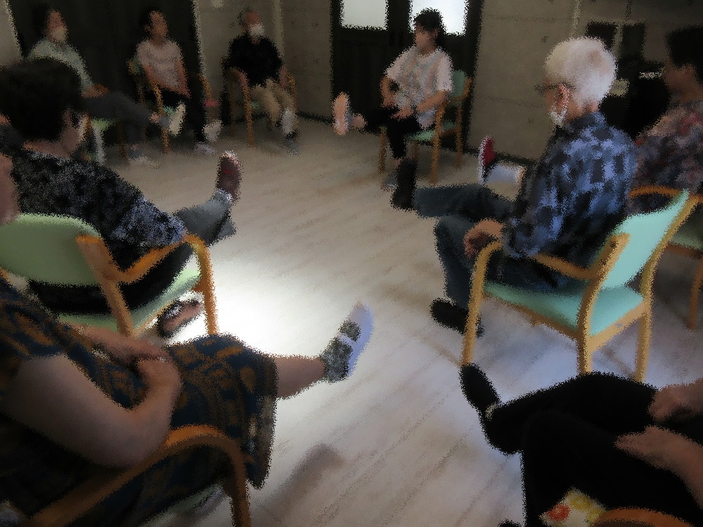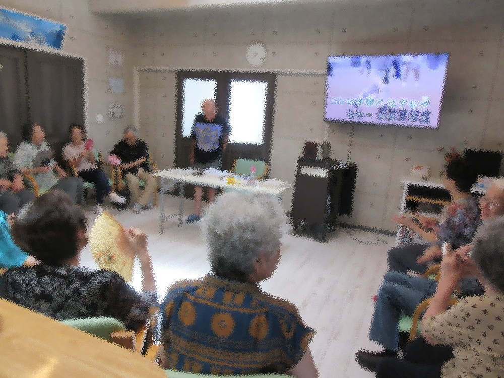 今回のサロンではおなじみのストレッチと簡単な運動から始まりました。 耳引っ張り体操から段々と下に降りていき肩周りや腰回り・足先までしっかりと動かし、 体操の中にも脳トレを取り入れたりしながら体と頭を両方を鍛えていきました。 少し体を動かしただけでもすぐに暑くなり汗がでるので、合間合間に深呼吸をしたり体操の後に水分補給をしていきました。