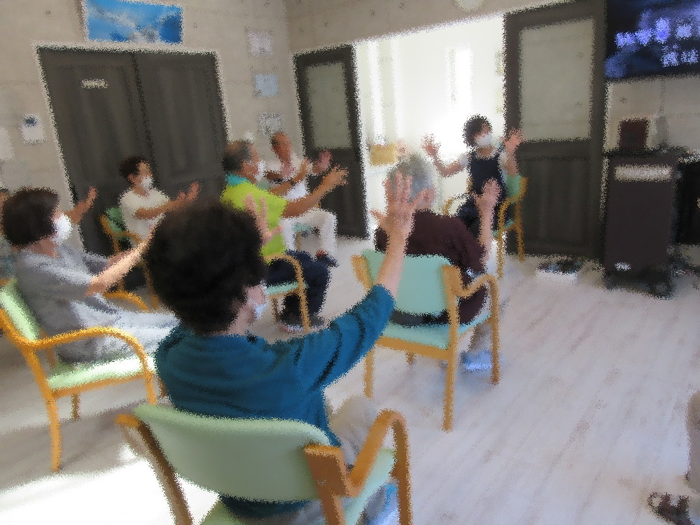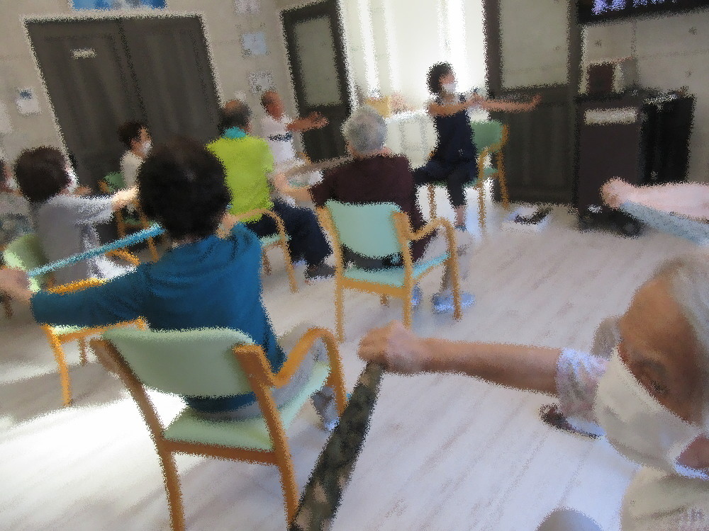 本日の体操はゆっくりと行っていきました。 首の体操から始まって肩周りの体操、腰をひねったり足首をまわしたりと全身の体操を時間をかけて行い、 後半はネクタイを使った運動をして更に肩周りや腰を重点的にストレッチしていきました。 ネクタイ一つでも、ネクタイを伸ばして持って左右にひねったり、指先だけでネクタイをたぐり寄せる指の体操など色々な体操が簡単にできます! ご家庭ですとタオルでも出来ますので、みなさんも真剣に体操に取り組まれ、覚えようとされていました。