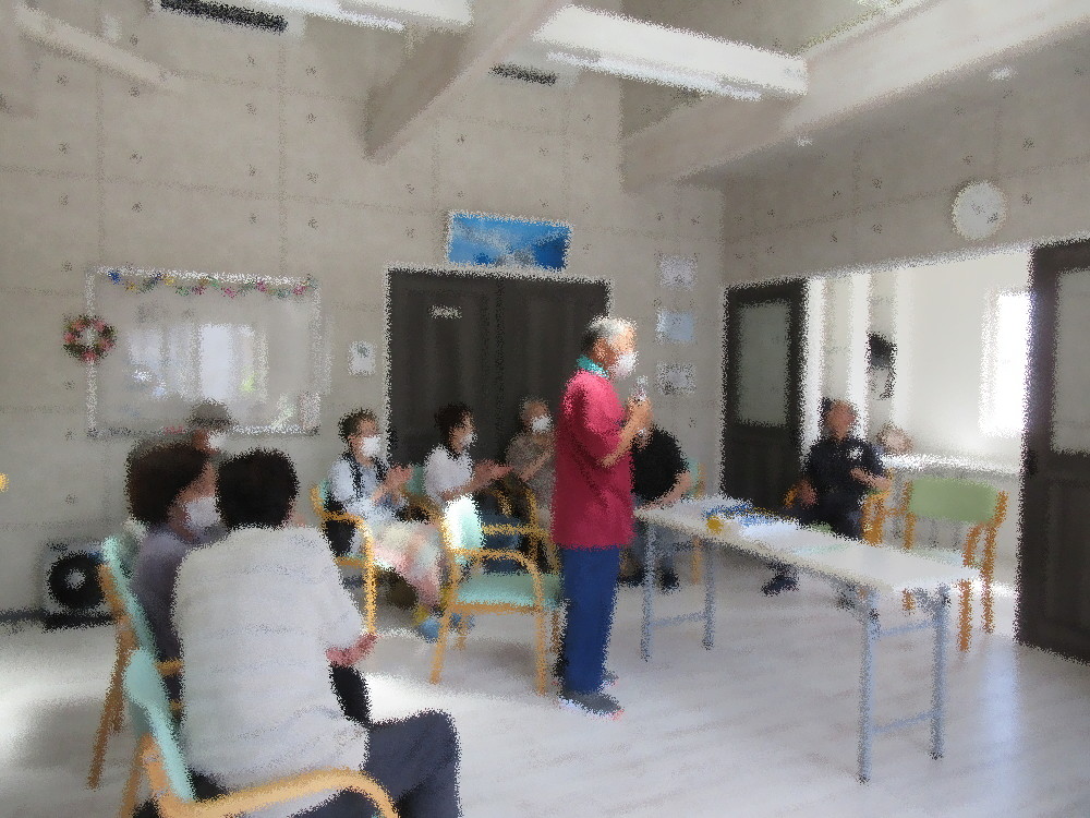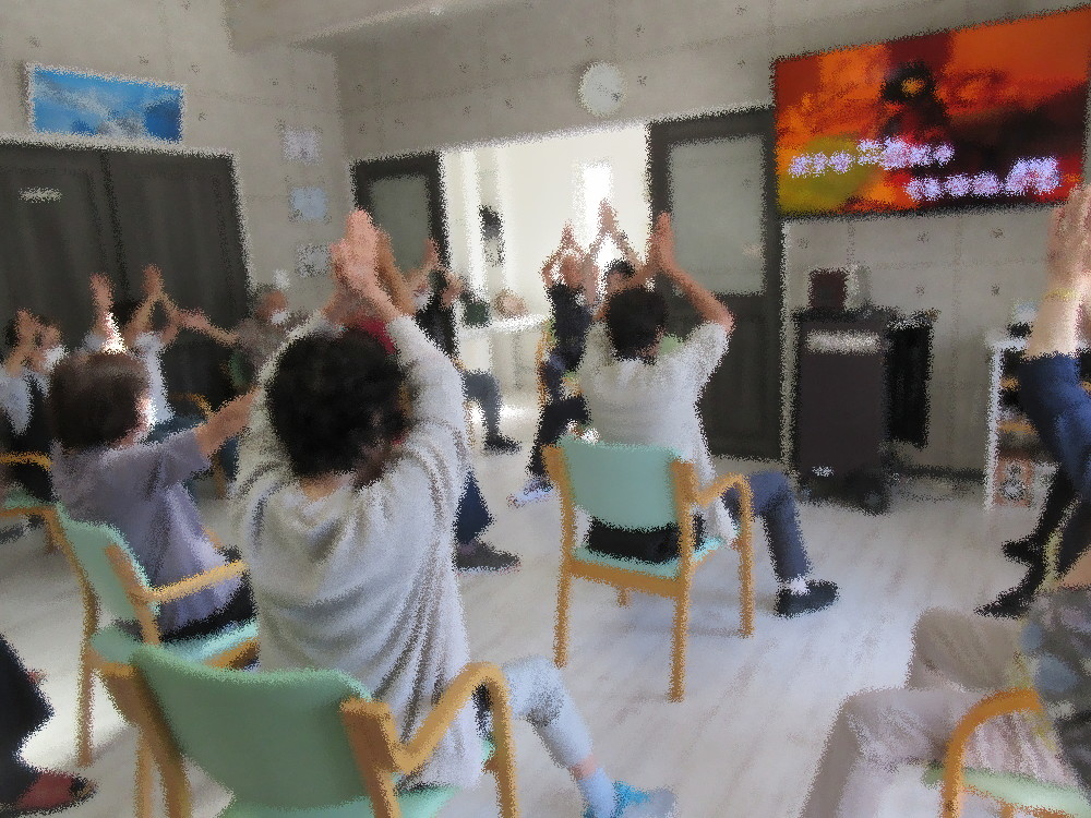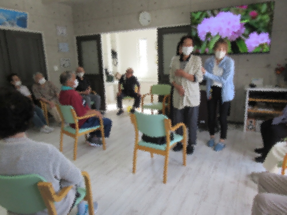 本日のサロンでは新しい方が1名参加されました! みなさんに紹介した後に自己紹介をして下さり、みなさんも一人ずつ自己紹介をしてから始まりました。 体操は社長が行い、ゆったりとした音楽に合わせてまずは姿勢を正して深呼吸から。 その後首のストレッチと方のストレッチを行いました。 人によって肩が上がる方、動かしずらい方、痛みを感じる方とそれぞれです。 痛みを感じる方はどうしても動かさないようにしてしまう傾向にあるので、 筋肉が固まらないようストレッチをしながら自分の体と向き合い、「ここまでなら動かせる」というラインを把握しながら 取り組んでいきました。 後半ではアップテンポな音楽に合わせて足踏みや足を開いたり閉じたりする体操で心拍数をあげ、脳トレも出来る体操をしていきました。 胸がパー・前がグーの脳トレ体操では間違えたり途中でわからなくなってしまう方がいらっしゃいましたが、 近くにいた職員がサポートに入ったりアドバイスをしながら最後まで諦めず取り組むことが出来ました。
