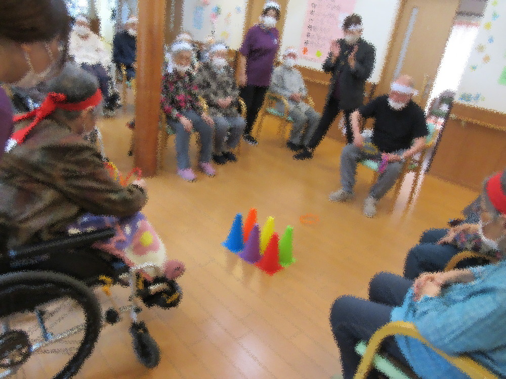 第二種目はお玉リレー。先程のボール回しよりも難しいお玉でのボール回しです。 ボールも小さくなってみなさん落とさないように丁寧に次の方へ回しており、こちらは職員も合わせて4回戦行いました。 白組がとても上手で今回は白組の勝利となりました。