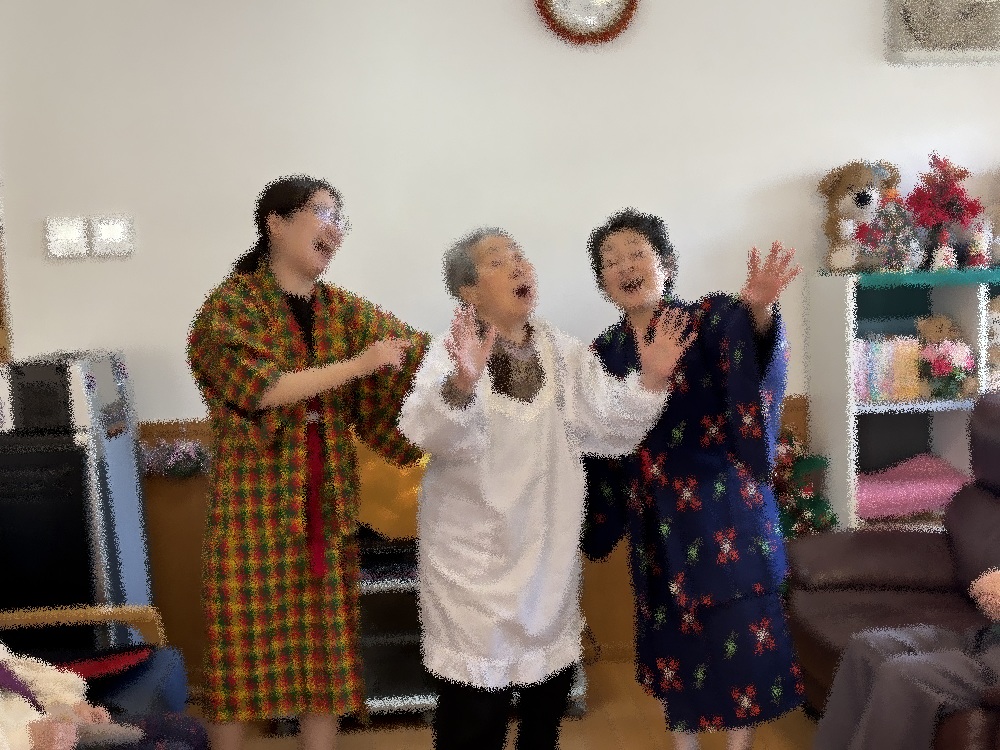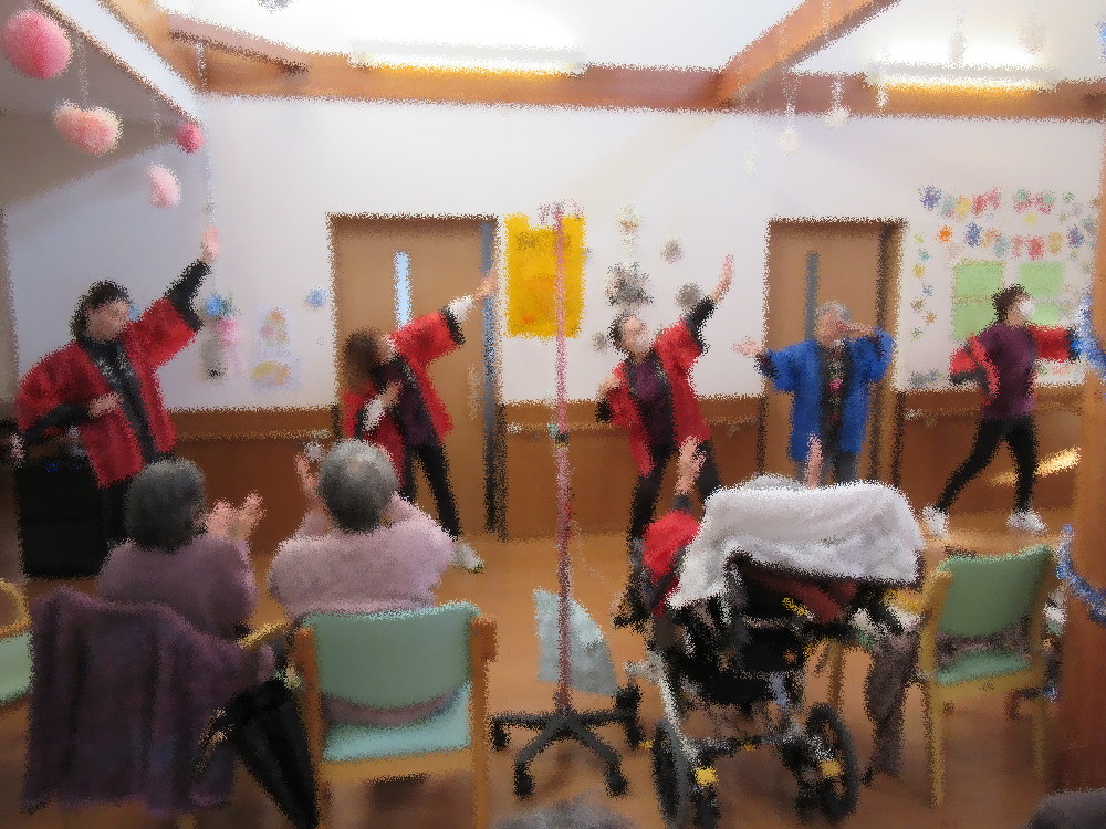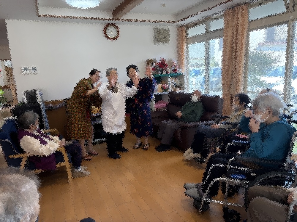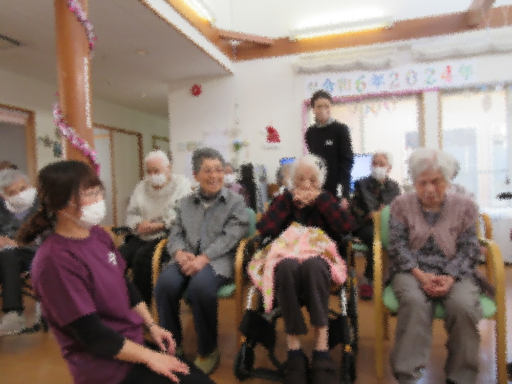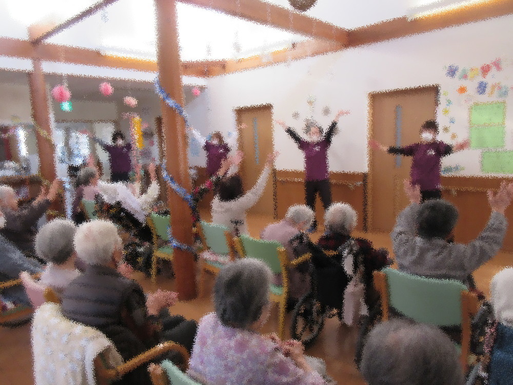小規模では5名の方が今月誕生日を迎えられます! まずはお誕生日の方の紹介から始まり、お一人ずつインタビューをして一言頂きました! みなさんからはハッピーバースデーの歌のプレゼントをしていきました。 お祝いされたみなさんはとても嬉しそうに「ありがとう~!」とお礼を言っていました! その後は歌謡体操で体を動かした後、職員による踊りを見ていきました! 最初はみなさんご存じの「YOUNG MAN」から!一度は聞いたことがあるサビのメロディーに一緒に踊る方も♪ 2曲目は法被を着て「よさこい踊り」!この時期になると銚子もよさこい祭りがありますね! 銀河で小さなよさこい祭りをしました!職員だけでなく利用者様も参加し、見ている方は「よっこいしょー!」とかけ声をかけて大盛り上がりでした!!