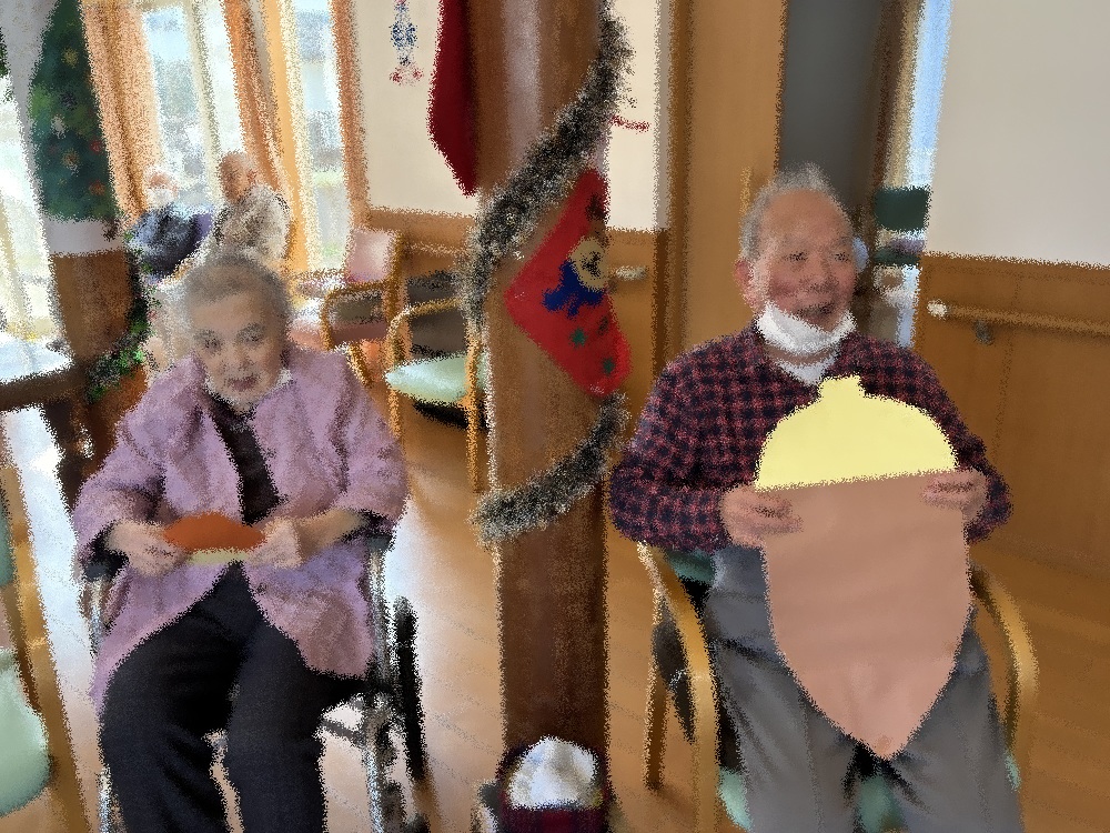 今月はグループホームでは誕生日を迎える方はいらっしゃらず、まずはおなじみの歌謡体操で体をしっかりと動かしてから秋の歌を歌いました。 職員は浴衣に下駄で子どもの姿に、利用者様に割烹着でお母さんになって登場!みなさんおおきな拍手で迎えられました。 他の利用者様は秋の味覚、どんぐりや栗・キノコやリンゴなどを持って音楽に合わせてゆれながら、 「里の秋」・「紅葉」・「真っ赤な秋」・「かあさんの歌」を元気に歌いました♪