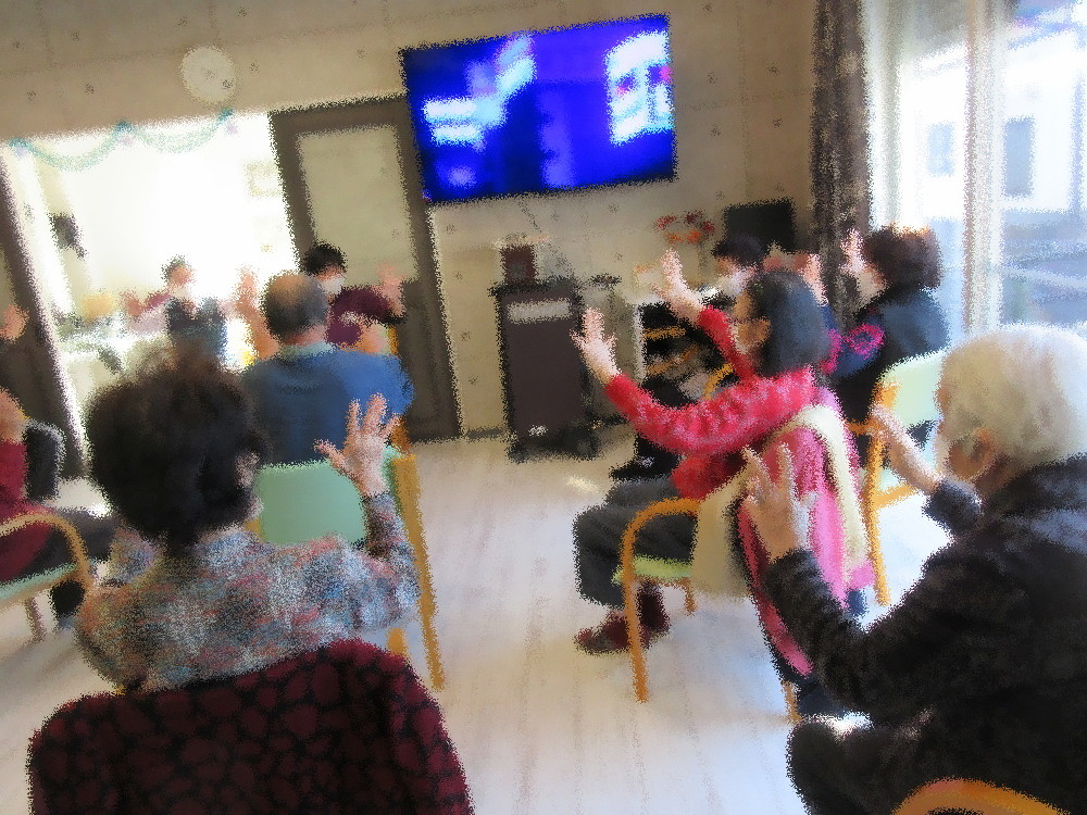 本日のサロンではまずは全身のストレッチから始まり、首・肩・足など一つ一つ順番に伸ばしていきました。 今回は元気なみなさんが引き続き元気に過ごせるよう転倒防止を兼ねて足のストレッチや運動を多く取り入れ、 足上げやかかと上げ、足踏み・足首回しなど様々な体操で鍛えていきました。 最後は両手を胸の前でクロスし、ゆっくり時間をかけて立ったり座ったりの運動をしていきました。 一見簡単そうに見える動きですが手を使わずゆっくりと行うことで十分な筋トレになっていました。 後半は指先の運動と早口言葉、脳トレとして漢字読みクイズをしました。 早口言葉では“ゆっくり・はやく”のコースからはやくを選び、職員が読み上げた後を追う形で読んでいったのですが なかなか最後まで噛まずに言えず、思わず途中で笑ってしまいながらも諦めることなく取り組まれていました。 漢字読みクイズでは“魚の名前・花の名前・食べ物の名前・月の読み方”などいろいろなクイズが出ましたが流石の一言に尽きます! 間違えることなく出されたお題にパッと回答を出せ、けっこうな数のクイズをしましたが問題なく答えられていました。