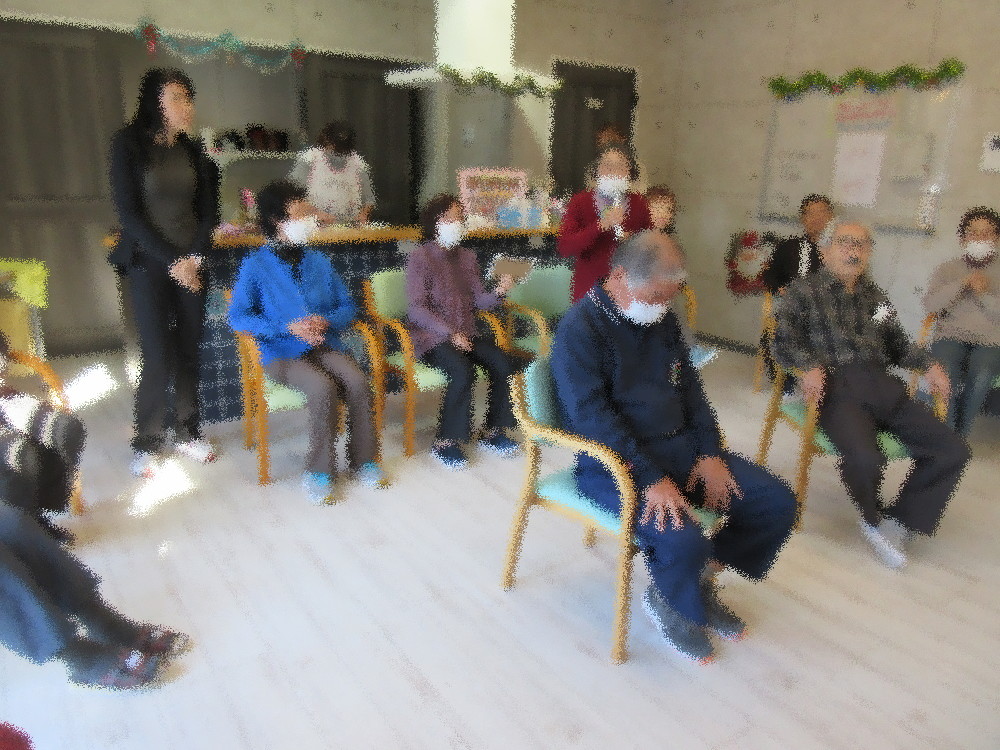 あっという間に12月になり、今年のサロンも今回を合わせてあと3回となりました。 体操を始める前に1年の振り返りと来年の抱負を一人ずつ発表していきました。 それぞれいろいろな思い出を教えて下さり、みなさんのお話しから素敵な1年を感じることができました! 来年の抱負では「来年も元気にサロンに通いたい」と言って下さる方が多く、そのためにサロンや家で体操を頑張ると意気込んでいました。
