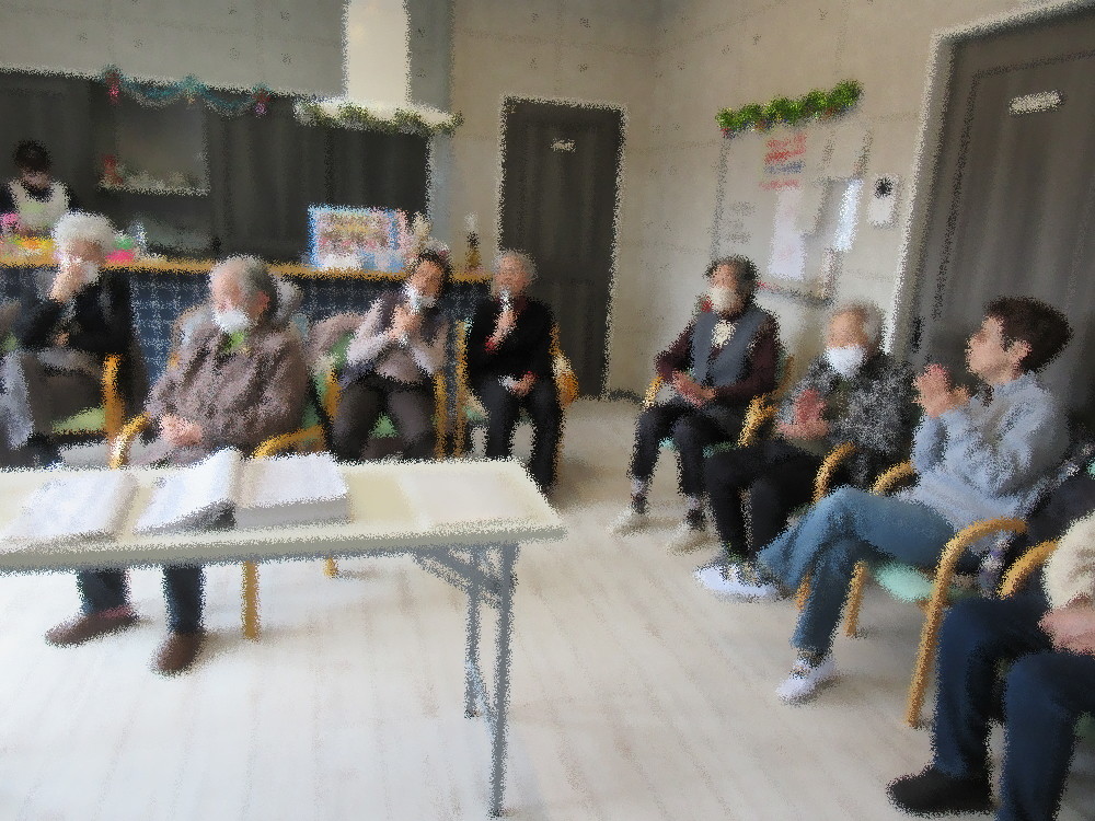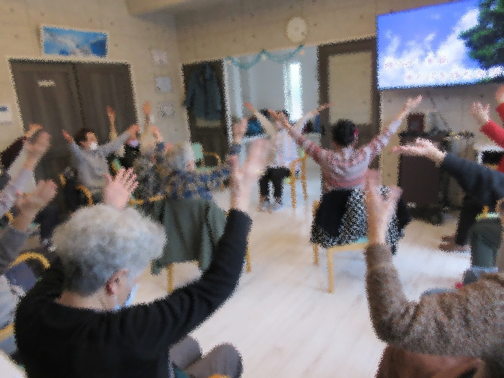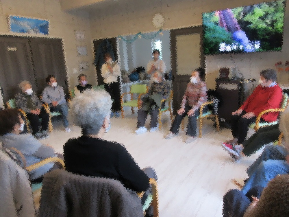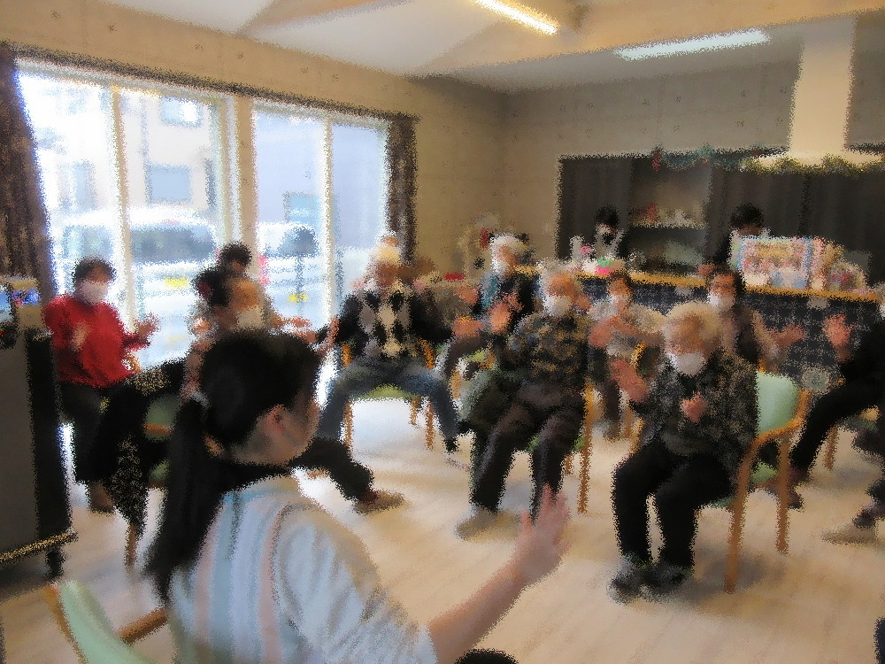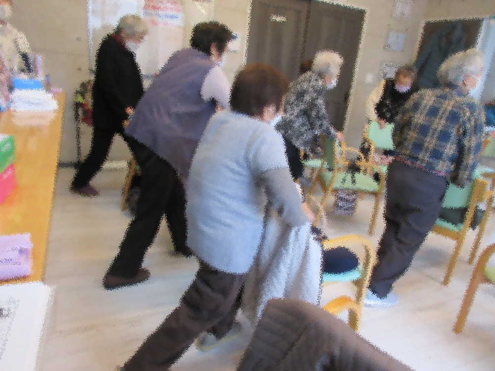 今回のサロンではいつも通りのストレッチから始まり、肩や足と部分的に体操していきました。 特に寒い日ではありますが体が固まらないようしっかりと動かし、 立ち上がってのかかと上げや足上げ、アキレス腱伸ばしやスクワットや座ったままでの足踏みで体温を上げていきました。 他にもグー・チョキ・パーの指先の体操に加え、足でのグー・チョキ・パーも合わせて行ったり、 指を回しながら足踏みをしたりと更に体を動かして終わる頃には上着を脱いでいる方が多くいました。 最後はみなさんで円になって来年の抱負を一人ずつ話していきました。 「来年も元気に銀河に行きたい」と言って下さる方がたくさんおり、他にも「たくさん散歩をする」・「お庭の手入れを頑張る」など素敵な抱負を発表してくださいました!