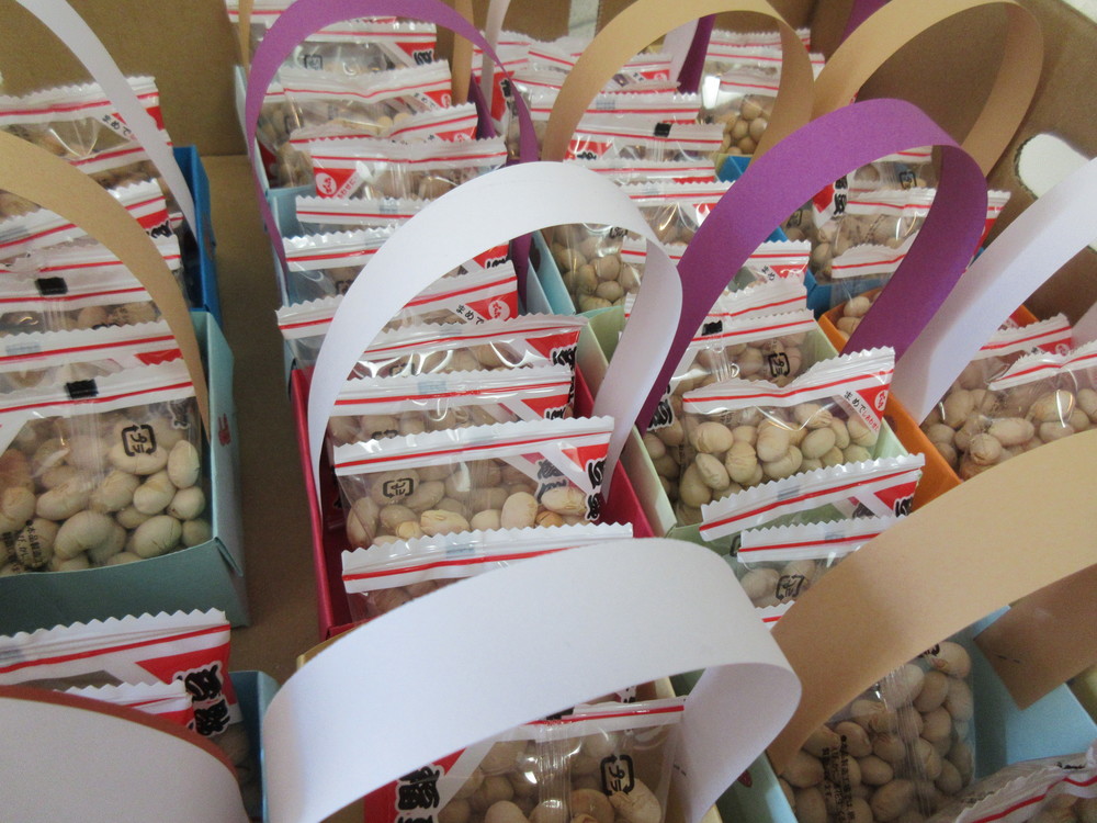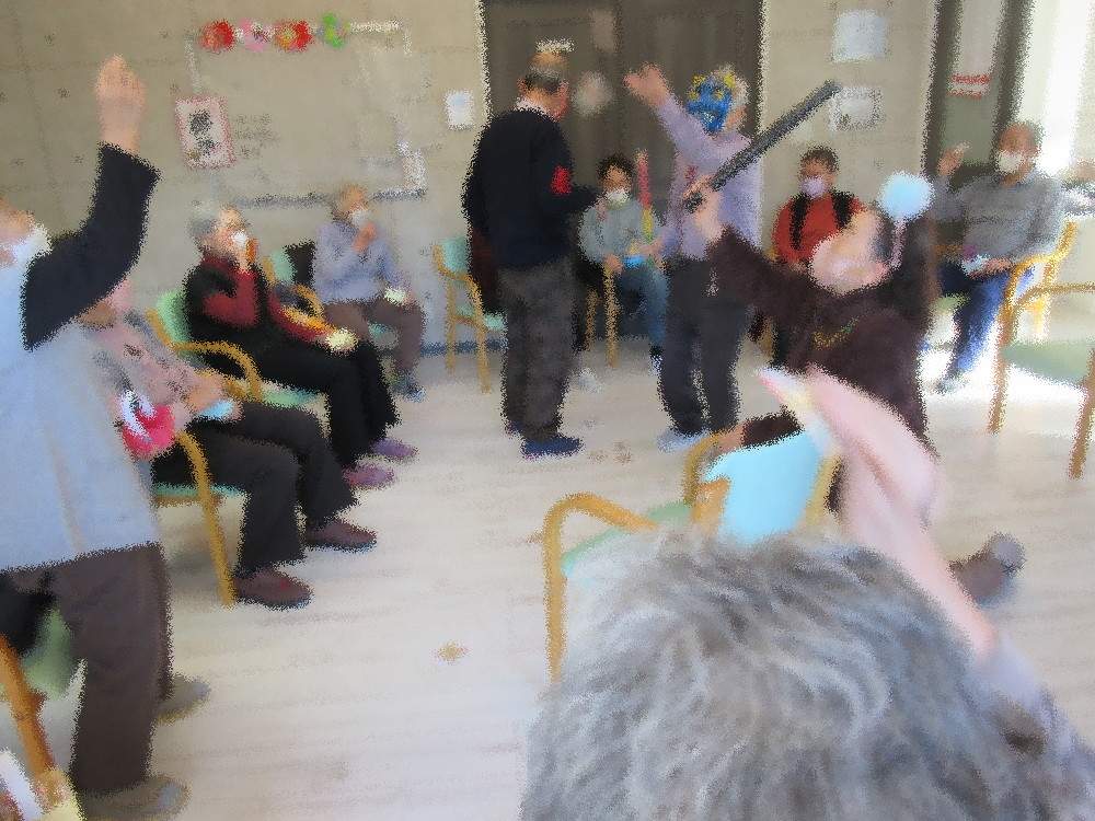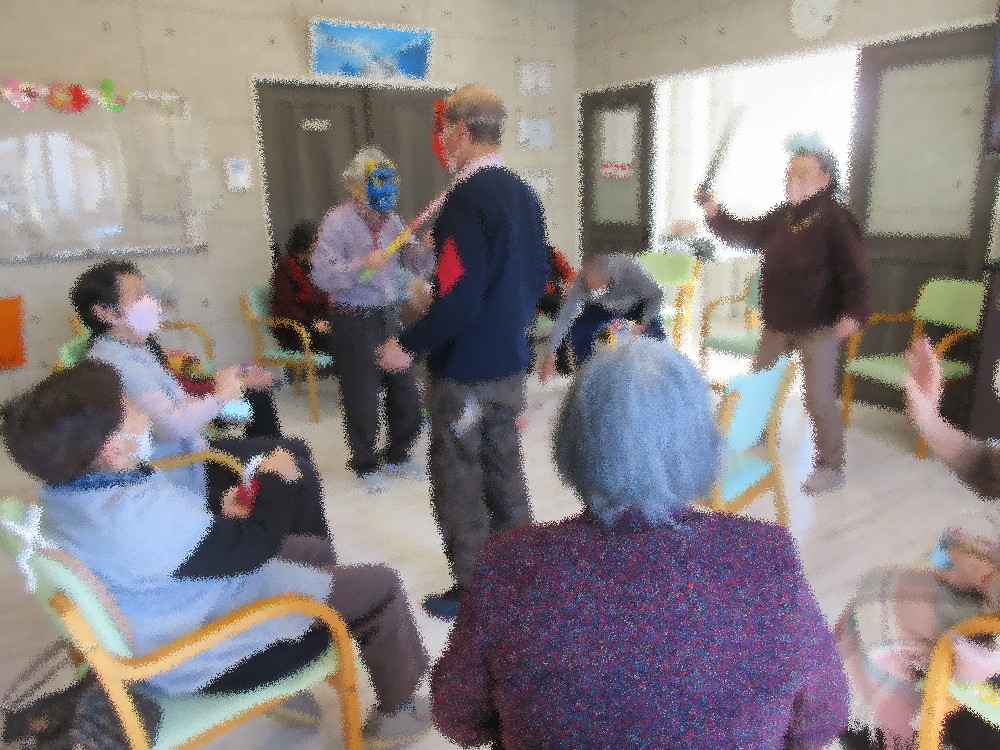 体操の後には水分補給をしてから豆まきをしていきました! 鬼役には自前の鬼の衣装を用意してきて下さった方と年男の方ともう一方男性がやってくださり、 3人の鬼をみなさんで祓っていきました! 始めは遠慮していたみなさんでしたが鬼役の方に「元気がない!」と言われ、 大きな声で「鬼は外!福は内!」と言い、豆を投げた後も拾って何度も鬼を倒せるまで投げていました! 無事に豆まきも終わり大きい声を出したのでその後のカラオケもいつもより声が出ていたように感じます♪ みなさん思い思いの曲を選んで歌われていました(*^_^*)
