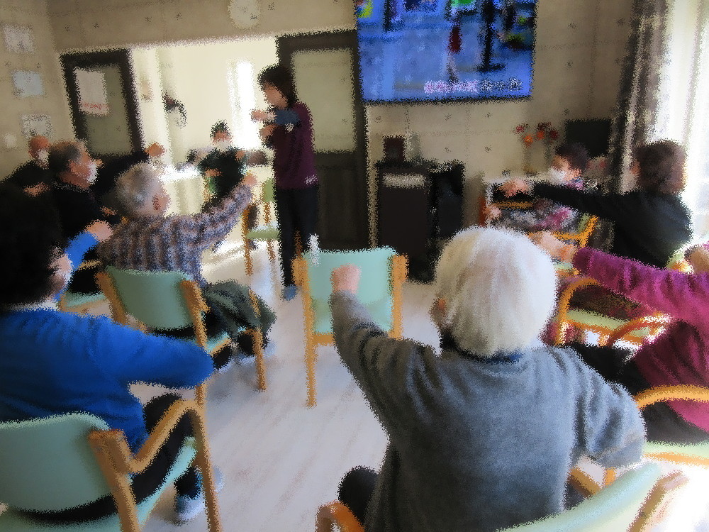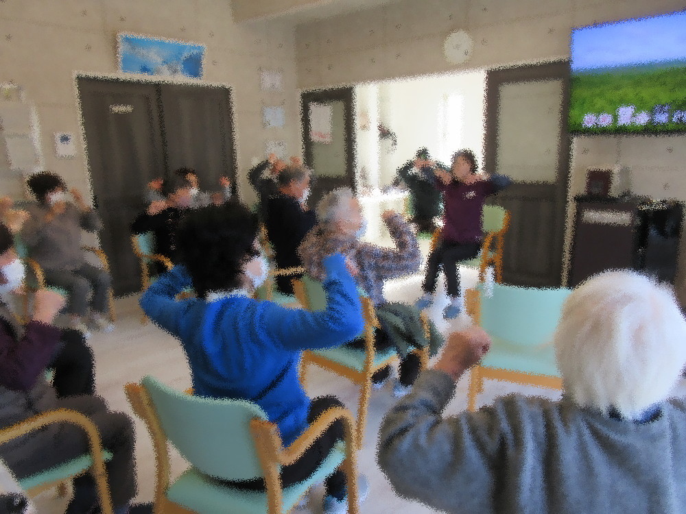 体操はゆっくりとストレッチから始まり上半身・下半身と分けて重点的に取り組んでいきました。 体が動かしやすくなったところで立ち上がっての運動や、 椅子に座って足踏みをしながら3がつく数字と3の倍数で拍手をする運動をしました。 簡単そうに見えて3の倍数に注目がいき、13や23で拍手を忘れてしまったりと何回か挑戦しました! 後半は脳トレ体操を中心に胸がチョキ・前がパーで入れ替える体操や、指を折りながら10まで数える脳トレをしていきました。 数を数えるのも片手だけ先に1本折ってから数えることで一気に難易度が上がり、真剣に取り組まれていました。