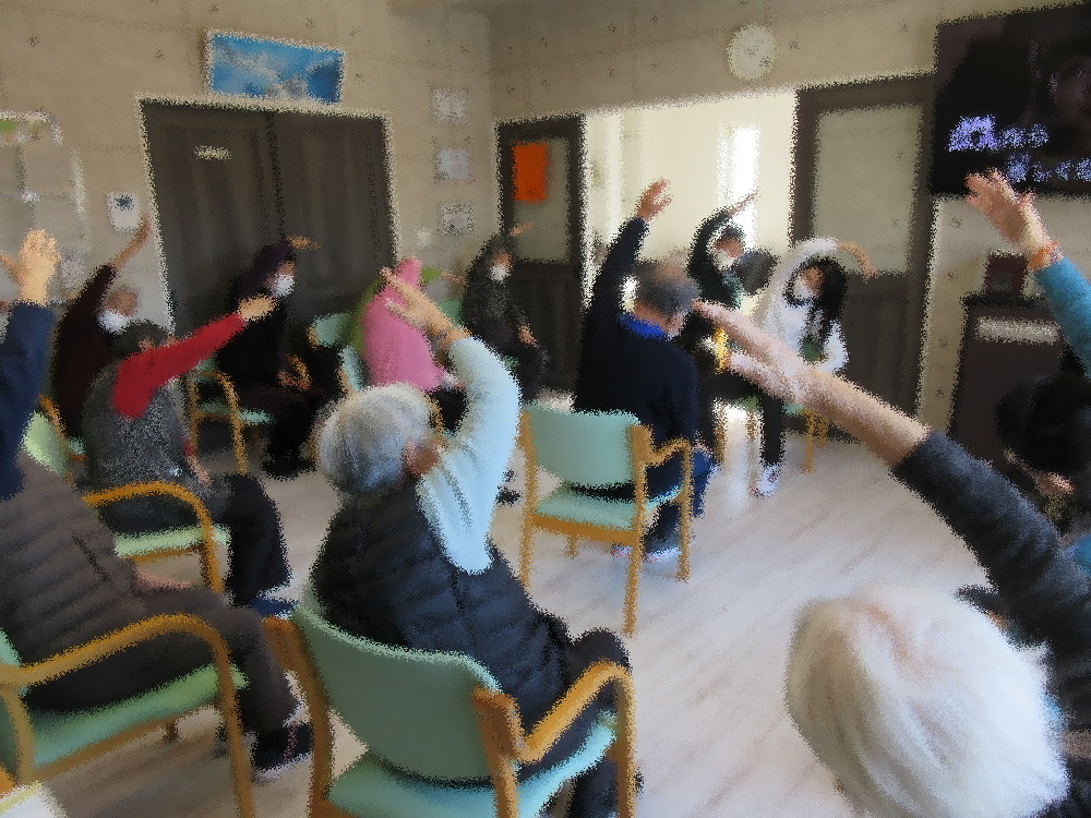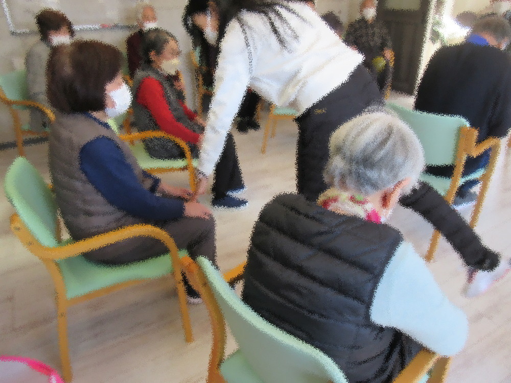 火曜日のふれあい交流サロンでは社長が体操を行い、ゆっくりと一つ一つの動きを意識しながらストレッチをしました。 首から肩・腰・足先まで十分にストレッチをして動かしやすくなった後はボールを使った筋トレ! 指先まで使って握りしめたり、左右でボールを持ち替えたり、足に挟んで潰したりと全身を使って行いました。 簡単な筋トレではありますがきちんと行うと結構な運動量があり、 筋トレ中はしっかり力が入っているか社長が一人一人回って確認しているのでみなさんも真剣です! 最後は音楽に合わせて座ったままウォーキングをしていきました!