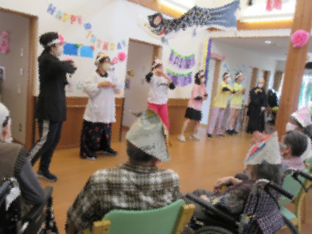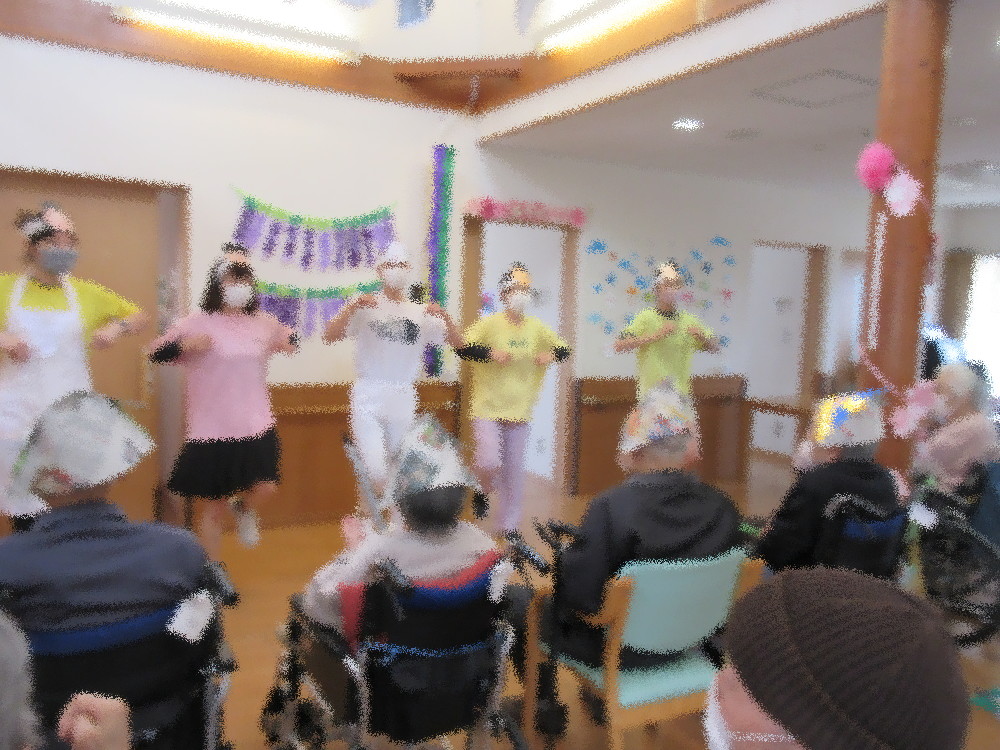 5月という事で「こいのぼり」の歌をみなさんで合唱し、お待ちかねの職員によるダンス披露がありました! 今回はみなさんのお誕生日をお祝いにきた仲良し家族の磯野家です! サザエさんを先頭に磯野家のみんなやタマ、中島くんに花沢さんまで来てくれて大人数で「サザエさん」を踊りました! なるべく衣装もキャラクターに寄せ元気いっぱい踊る職員にみなさん大盛り上がり♬ リズムに乗って大きな手拍子で最後まで楽しんで見て下さいました(*^_^*)