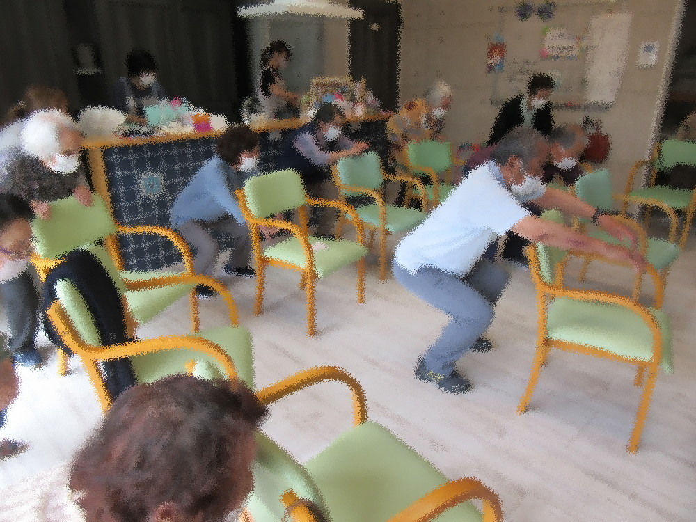 体操は社長が行い、大きく深呼吸から全身のストレッチをスタートしました。 今日みたいな雨模様だと頭が重くなってしまう方も多くいらっしゃると思います。 前回に引き続き自律神経を整えるストレッチを中心に首周りから背中にかけてを丁寧に伸していきました。 ストレッチ一つでも座骨を立てて座ったり、ポーズによっては尾骨を意識したりと 座り方を変えながらボールを使って全身のストレッチと筋トレをしていきました。 しっかりと体がほぐれたところで音楽に合わせて足踏みとグーパー運動で簡単な脳トレや、 立ち上がってダンスエクササイズとスクワットで体を動かしていきました! 最後には呼吸を整えながら瞑想をして終了しました。