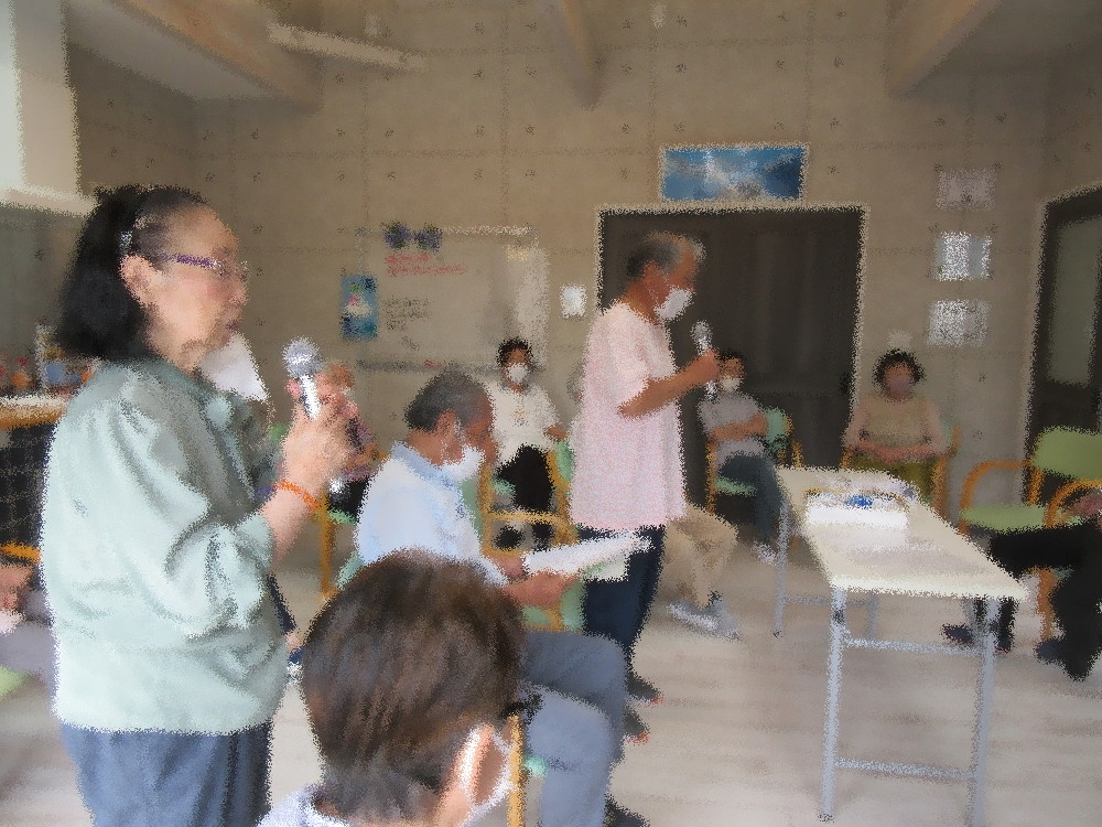 体操の後はしっかりと水分補給をして体を落ち着かせてからカラオケタイム♪ みなさんそれぞれの十八番の曲を選び、披露していきました。 ペアでの掛け合いや合いの手など今回のカラオケも時間まで盛り上がっていました!