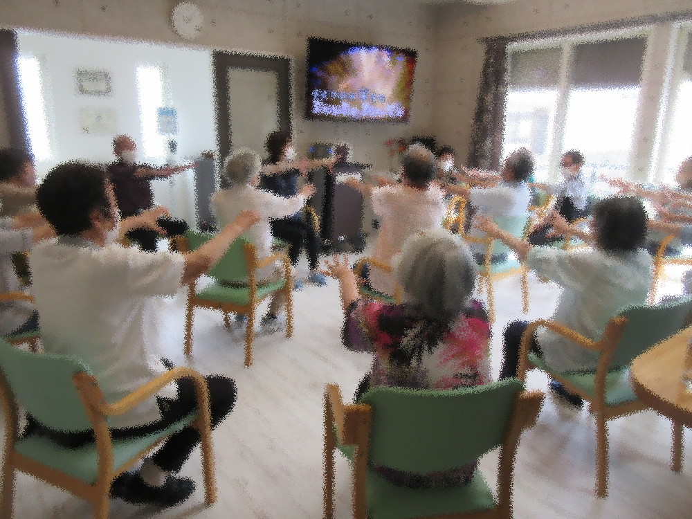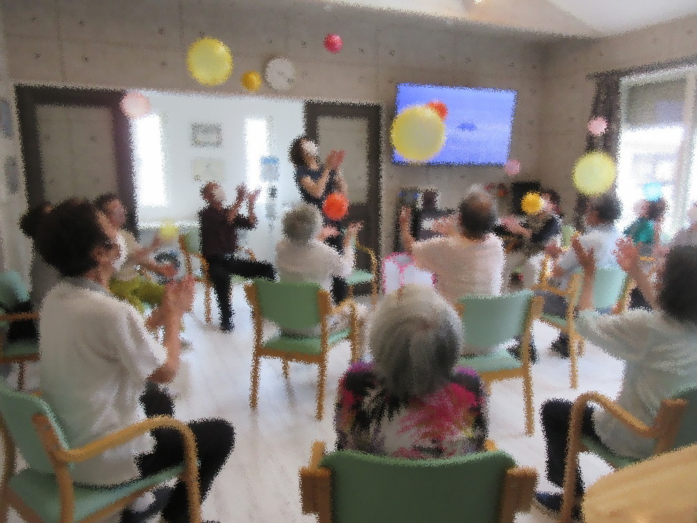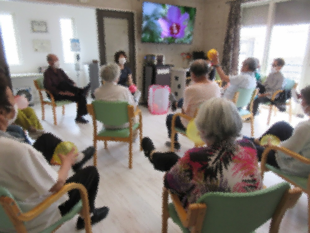 本日のサロンでは小規模多機能ホームの職員がボールを中心とした体操を行いました。 まずは簡単にストレッチで全身を伸したり足の体操で体を動かしていき、 体が動かしやすくなったところでボールを使った運動をしていきました! ボールを投げてキャッチする動きを全員で10回挑戦していき最初はなんなくクリア! 次はボールを投げている間に拍手を1回…それが出来たら拍手2回とどんどん難易度を上げていき、 拍手2回になるとキャッチ出来なかったり落としてしまう方が多くいましたが最後まで諦めず挑戦されていました。 その後は片足上げて足の間でボールを持ち替える運動をゆっくり行い、深呼吸をして終わりました。