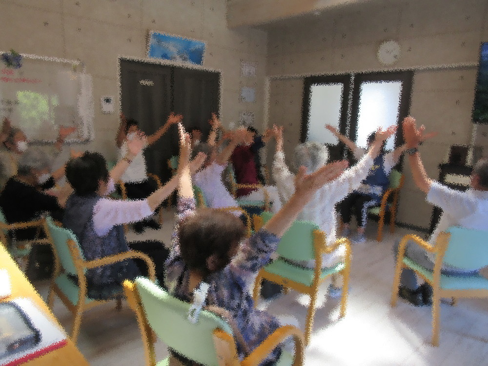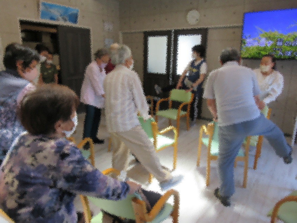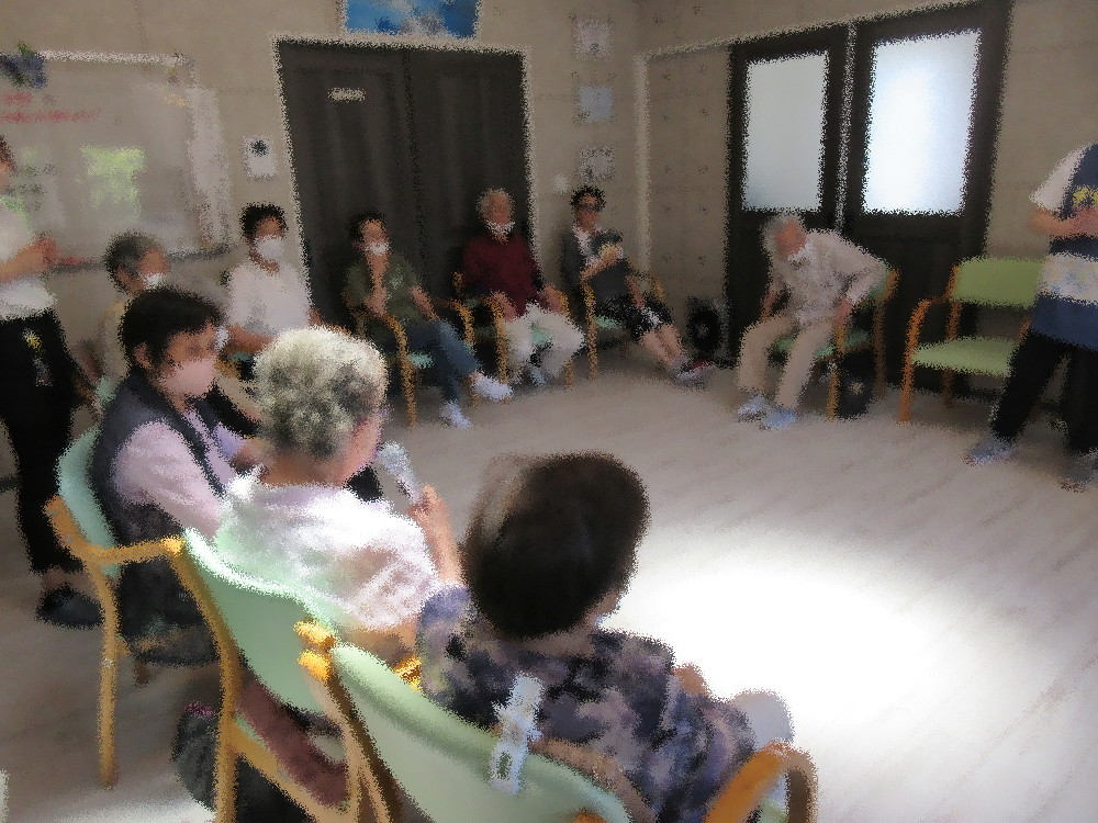暑い日が続いていますがみなさんとっても元気に来所され、体操も積極的に取り組まれております! まずは涼しい部屋で体を落ち着かせながらストレッチ。 深呼吸を意識しながらゆっくりと体を伸し少しずつ運動量を増やしていき、 後半には足踏みや立ち上がって足上げ・スクワットでしっかりと動いていきます! 今回は脳トレとして想起トレーニング を行い、昨日の晩ご飯を何個でもいいので思いついたものを答えていきました。 3品くらいしっかり覚えている方もいれば、食べた事は食べたけど忘れたという方もおり ゆっくりと考えながらも全員回答する事が出来ました!