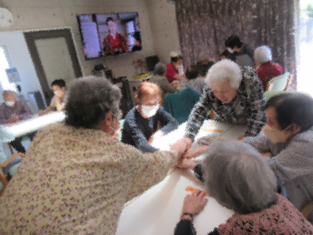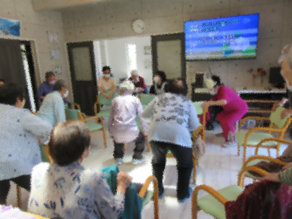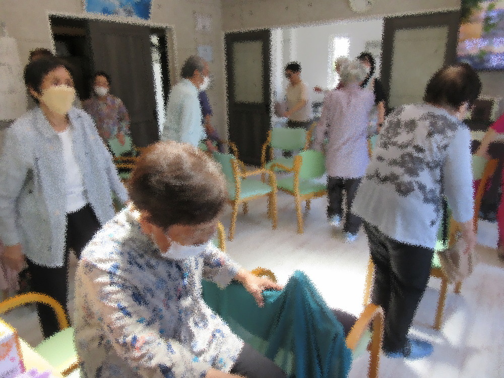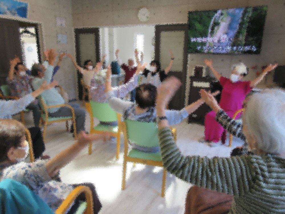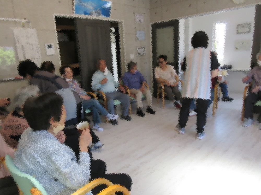本日のサロンではいつも通り耳引っ張り体操から全身スリスリで血行をよくしてからストレッチしていきました。 まずは首から肩・足と順番にストレッチをしていき、途中から立ち上がって踵上げや足踏みを行いました。 足踏みでは椅子の背もたれに掴まりながらしっかり足を上げ音楽に合わせてリズミカルに足踏みをしていき、 掴まる手と向きを変えながら更に足を上げていきました。 スクワットまで余裕でこなして後半はグーチョキパーで出来る指先を使った運動をしていきました。 最後にみなさんの顔が見えるように円になって座り、想起トレーニンフとして「昨日食べた晩ご飯」を一人ずつ発表しました。