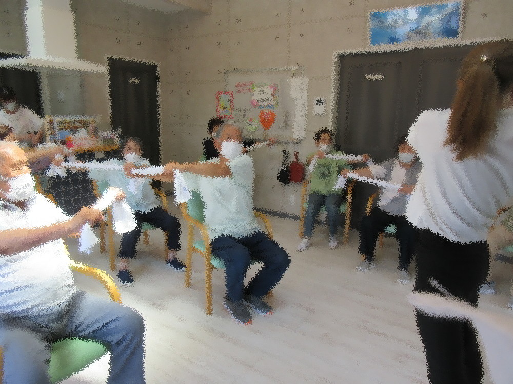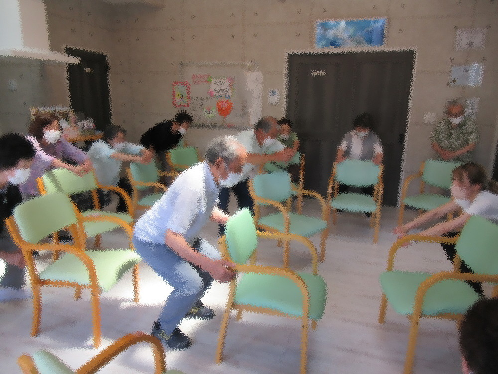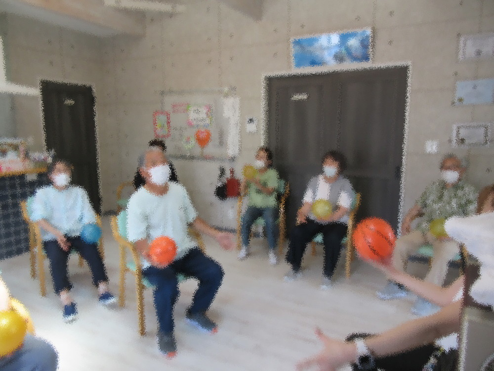 本日は職員による介護予防体操から始まり、暑さが本格的となり熱中症が心配されるようになりました。 深呼吸をしてゆっくりとしたストレッチで徐々に体を動かしていきました。 体が慣れてきたらボールを使い肩甲骨を中心とした体操や足に挟んで筋トレを行い、 タオルを使って肩や腰を伸すストレッチをしていきました。 最後は立ち上がって足踏みからスクワット!ゆっくりめのカウントでしっかり腰を落としながら体勢をキープ! 時々スクワットの体制から少し腰を上げてキープ…。 みなさん「この体制キツいわ~!」と言いながらも最後までしっかりとやりいきっていました!