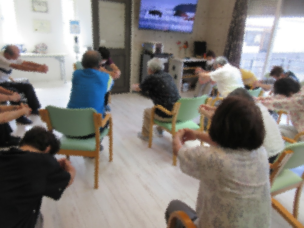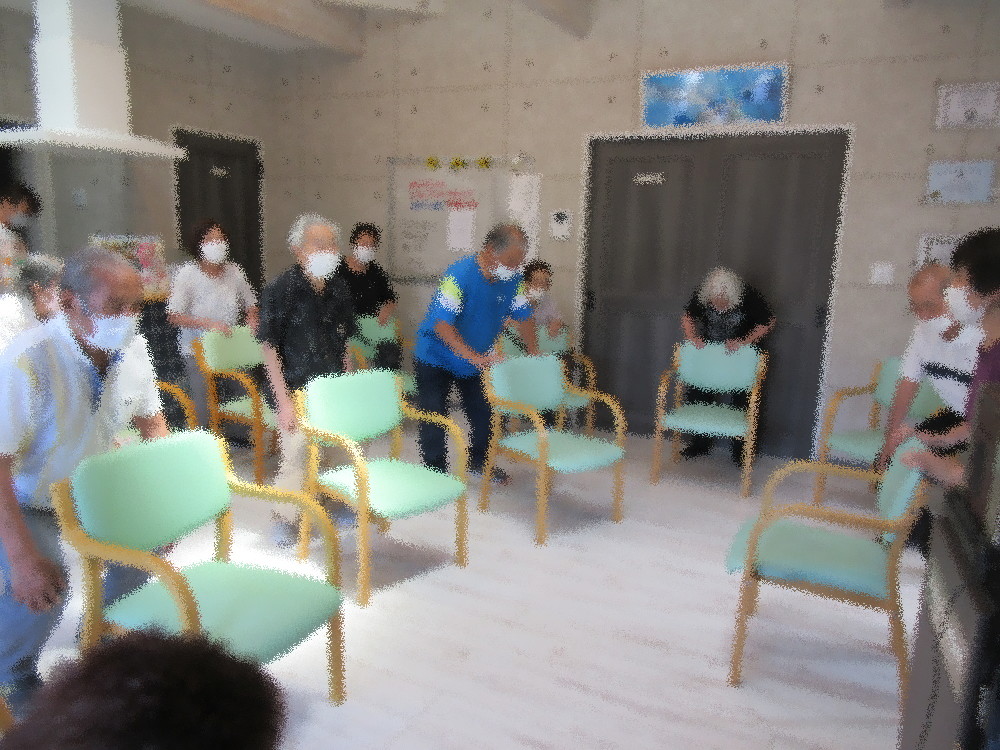 本日のサロンの体操は小規模より職員が行いました。 まずは深呼吸をしてストレッチから始まり、全身がよく伸びたところでラジオ体操をしました。 今回はラジオ体操第二で体を動かし、出来る方は立ち上がって行っていきました! おなじみのラジオ体操もしっかりと行うとなかなかいい運動になります。 後半は脳トレとして漢字クイズで一度呼吸を整えてから、最後は音楽に合わせてスクワット! かかと上げから足踏み・スクワットを「高校三年生」に合わせて行い、 「暑い暑い」と言いながらもみなさん余裕そうにすんなりとこなしていました。
