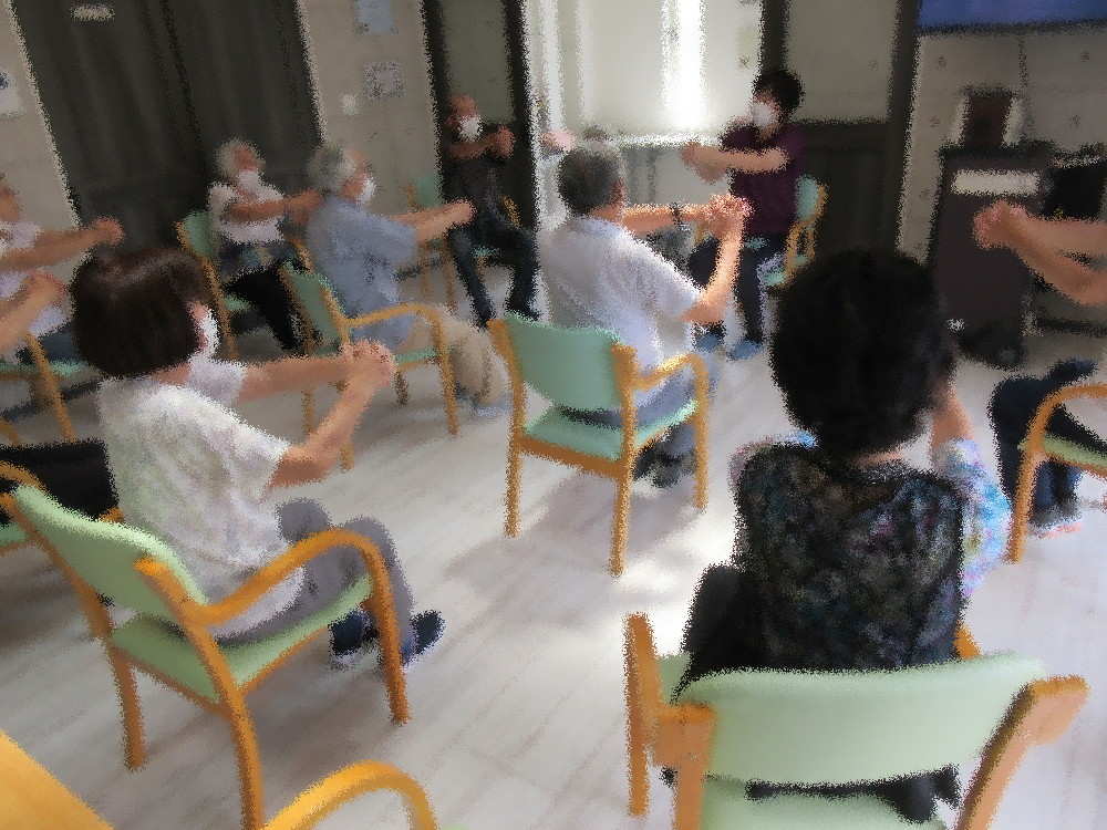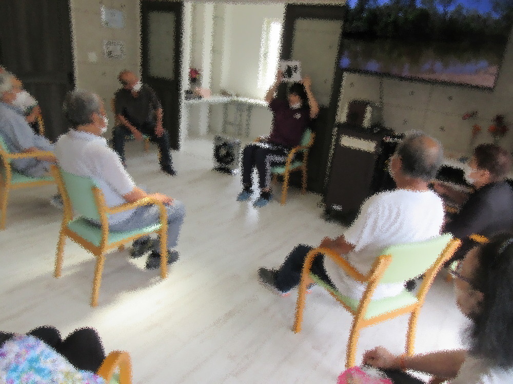 本日は小規模の職員による体操から始まり、まずは準備運動も兼ねてラジオ体操と歌謡体操で体を動かしていきます。 更に全身をストレッチで伸していき、簡単な筋トレも行いました。 今回は体操だけでなく脳トレとしてシルエットクイズにも挑戦していきました。 野菜や動物、乗り物などみなさん身近なもののシルエットクイズでしたが、 形が似ているものなどは引っかかってしまい笑いながらも楽しんで積極的に参加して下さいました!