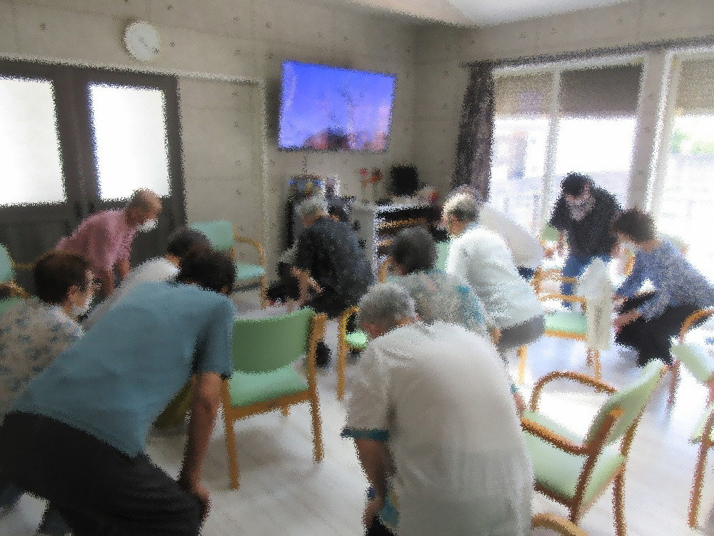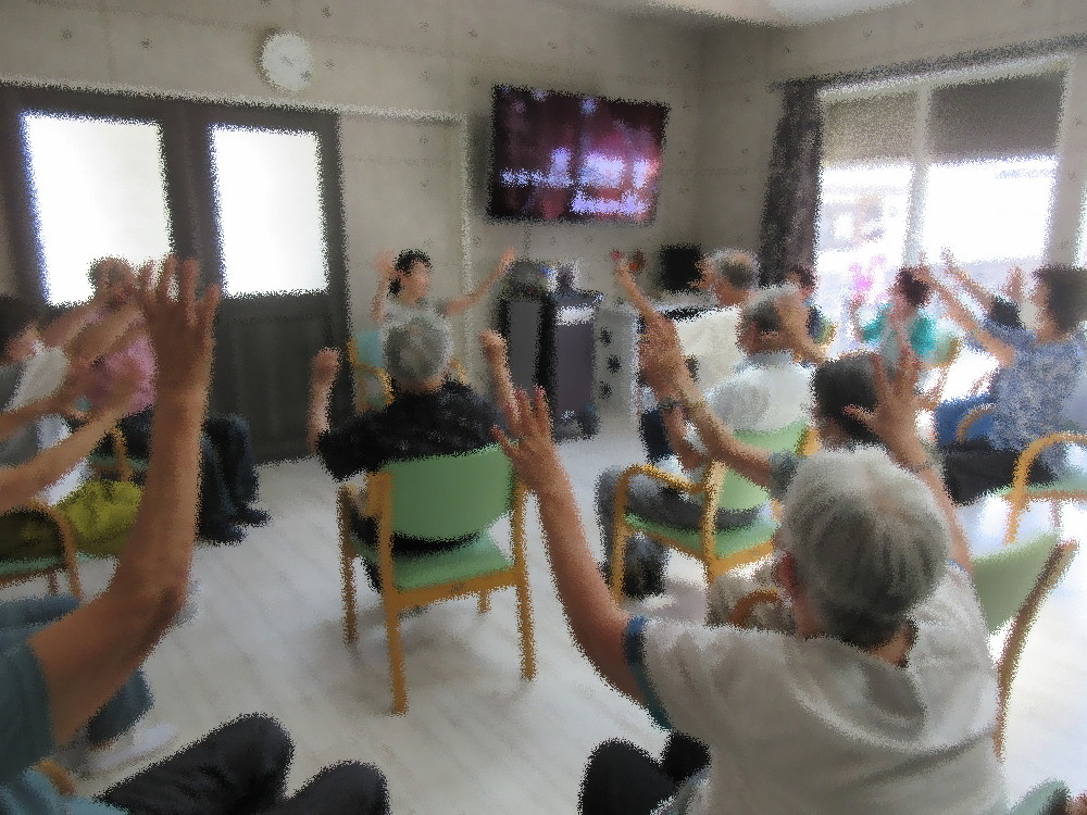 本日のサロンは始めの準備体操だけ小規模の職員が行い、その後社長が体操をしました(^_^)v 社長にバトンタッチするとみなさん気が引き締まったように感じます。 歌謡曲に合わせて腕を上げたり開いたり足踏みをしたりと全身を動かしていき、 後半には立ち上がってダンスエクササイズとスクワット! ダンスエクササイズも音楽をよく聞きながら左右前後とステップを踏み、ステップの間にリズムよく手拍子! そしてそのままスクワットをして足踏み・ステップと曲が終わるまで体を動かしていきました。