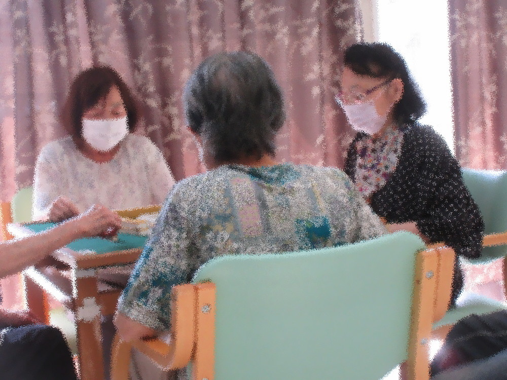午後からはトランプと麻雀と切り絵に分かれて活動をしました。 切り絵は前回に引き続き男性の方も眼鏡を持参してとても意欲的な様子でした。 トランプ・麻雀組もおしゃべりをしながら時間いっぱい楽しまれていました!