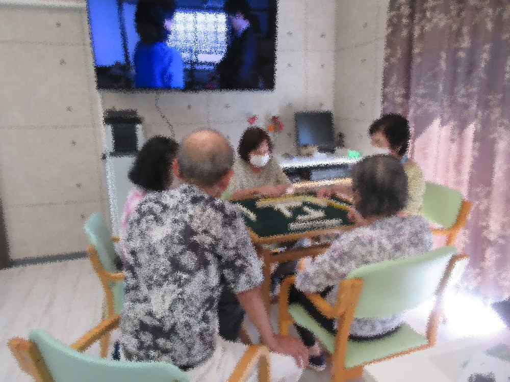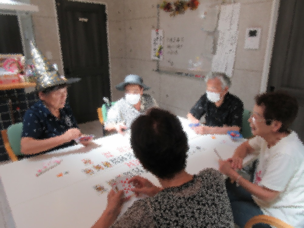 午後からはトランプ・麻雀・切り絵に分かれて活動し、 切り絵組では今回1枚の作品を完成させることが出来ました! トランプ組もおしゃべりをしながらゲームをされており、 天窓の光が熱いと帽子を探してきて好きな帽子を被っていました(*^_^*)