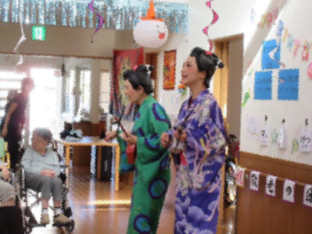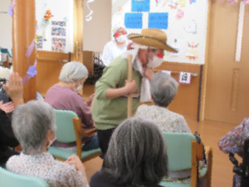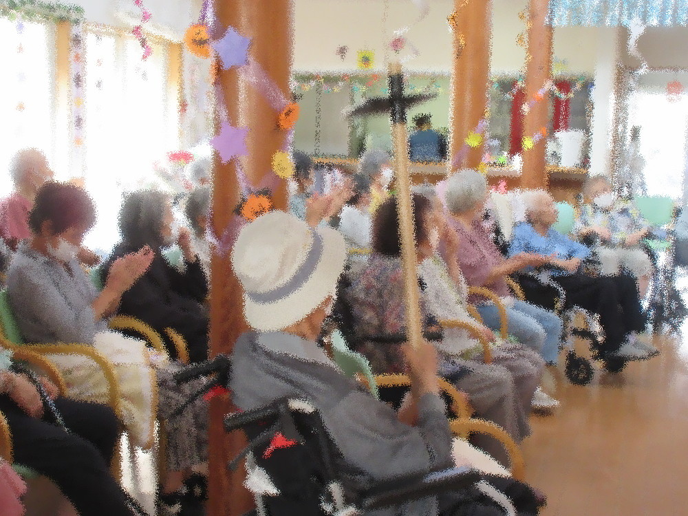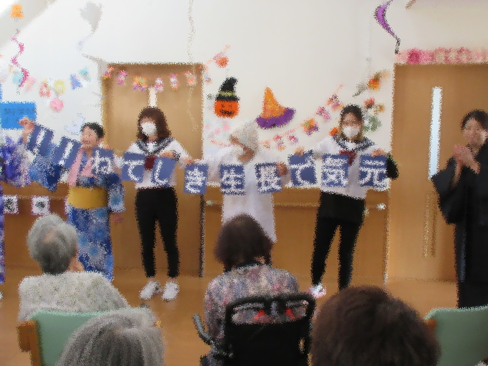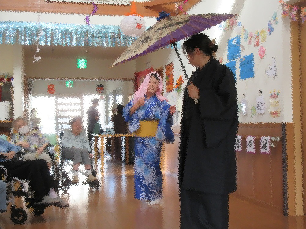 1曲目はセーラー服を着て「リンゴの唄」 かわいらしい姿でリンゴを配る職員にみなさんとても喜んでくださり「かわいいわ!」と大好評でした! 2曲目は久しぶりに登場した「こまどり姉妹」 浴衣を着てカツラを被り、頬紅を三味線を持って銀河のこまどり姉妹の登場! 大歓声で迎えられみなさん手拍子をしながら歌ってくれる方もいらっしゃいました! 3曲目は割烹着と帽子を被ったトレーナー姿の夫婦で「麦畑」 ほっぺにシールを貼った夫婦の掛け合いに大笑いで手をたたいて笑う方までいらっしゃいました! 4曲目は浴衣に番傘を持った二人による「細雪」 ゆったりとした音楽に合わせて美しく踊る職員にみなさんうっとり。自然と見とれてしまいました。 最後は全員で「東京ブギウギ」 ノリのいい曲に合わせて職員と一緒に踊ったり手拍子をして大盛りあがりでした!