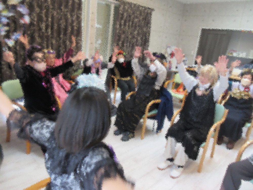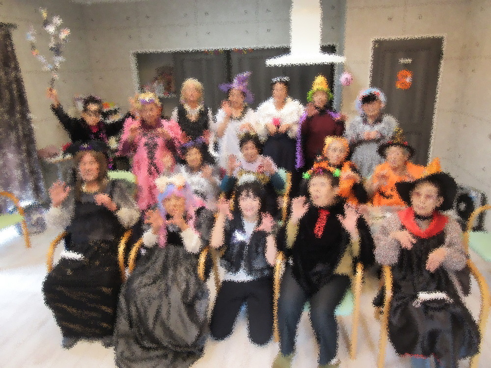 本日のふれあい交流サロンRUBYも1日早いハロウィンパーティー! みなさん好きな衣装を選んで着替えて準備万端! スリラーの音楽に合わせてまずはオバケに負けないように手を前に出しながら「アァーー!!」と大きな声で威嚇。 みなさんノリノリで大きな声を出していました(*^_^*) 次はオバケダンスでゆっくりと手を左右に揺らしながら足踏み、段々とスピードアップしながら足でリズムをとっていきます。 徐々に体が動きやすくなってきたところで立ち上がって足踏みとスクワット。 仮装は楽しみでも体操は一生懸命なみなさん。ワンピースの方などはスカートをまくし上げてスクワットされていました。 座って一呼吸…と思いきやまたまたオバケを威嚇!みなさんも楽しくなってきたようで声がどんどん大きくなっていきます。 最後はゲゲゲの鬼太郎の曲に合わせてオバケダンスとパンチ運動!力を込めて前にパンチ・上にパンチ・肘でパンチ! ハロウィンパーティーと言えどしっかりと体を動かしていきます! 背中を丸めるように下から前に腕を伸しオバケのポーズで呼吸を整えながら背中と肩甲骨を伸して体操は終了。