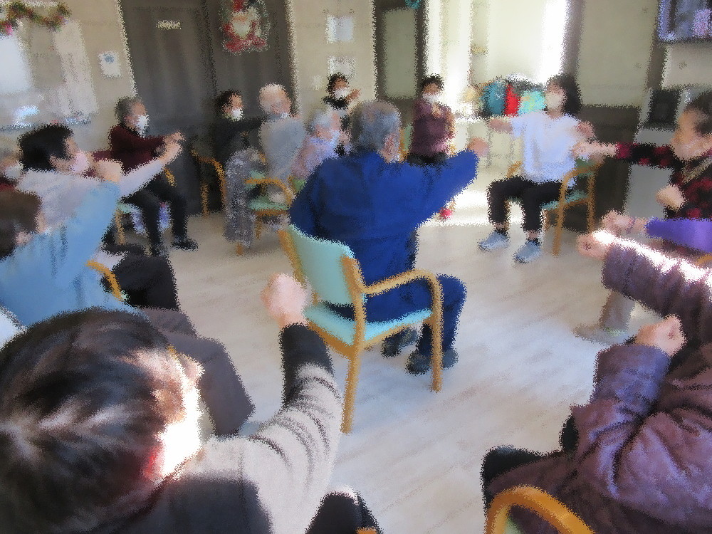 本日も体操は耳引っ張り体操からスタート! 耳から首にかけての血行をよくしてから肩周りのストレッチを行っていきます。 軽く肩を動かしてからつま先上げと踵上げ、足首回しをして簡単な足の運動も行いました。 全身が動かしやすくなってから立ち上がって踵上げと足上げ・スクワットで筋トレも! 座ってから指先の運動とパンチ運動で更に鍛えていきます。 みなさんパンチ運動になると気合いが入るようで大きな声でカウントしていました。 その後はみなさんで円になって他の方と被らないように甘い物を一つずつ上げていきました。 餡子にチョコにケーキなど思い思いの甘い物を上げていてほとんど被ることなく1周出来ていました! 最後に想起トレーニングとして昨日食べたご飯を3品あげて体操は終わりました。